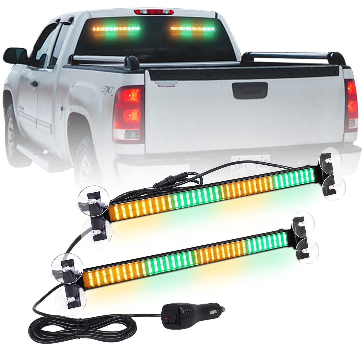 UPGRADED - This windshield traffic advisor strobe light bar has a total of 144 high-intensity Led chips, using floodlight PC lens, which can maximize the light output. Visible in day and night and lifespan over 50,000 hours. Innovative rotatable mounting bracket, which can be installed on any horizontal, inclined or vertical surface. | QUICK RESPONSE - This hazard emergency flashing strip is very suitable for the front or rear internal windshield. Different color combinations can attract the attention of others and are easy to see in rain, fog, dust, and snow to warn other vehicles. Guarantee the safety of drivers and pedestrians in bad weather. | 26 STROBE FLASH PATTERNS - 12V power, plug and play cigarette plug, convenient dual-switch design. One to turn on/off power supply, one to switch between 26 different flash modes . Including the last mode memory recall. These modes provide warnings for potential imminent dangers. | EASY INSTALLATION&WIDE USE- Includes 4 strong and stability suction cups bracket, firmly mounts on a smooth windshield or back window surface. Suitable for front/rear windshield mounting. Widely used for Hazards Warning, EMS, Law Enforcement, First Responder, emergency vehicles, construction vehicles, police, snowplow, postal and city service workers, etc. | DIMENSIONS -- The light bar has two pieces, each piece is 16.8 inches long.The length of the wire from light to light is 3.9FT(sold separately 9.8FT/3m extension cable wire Asin: B09VGVS6ZY ) . The length of the wire from the light to the cigarette lighter is 16.4FT.