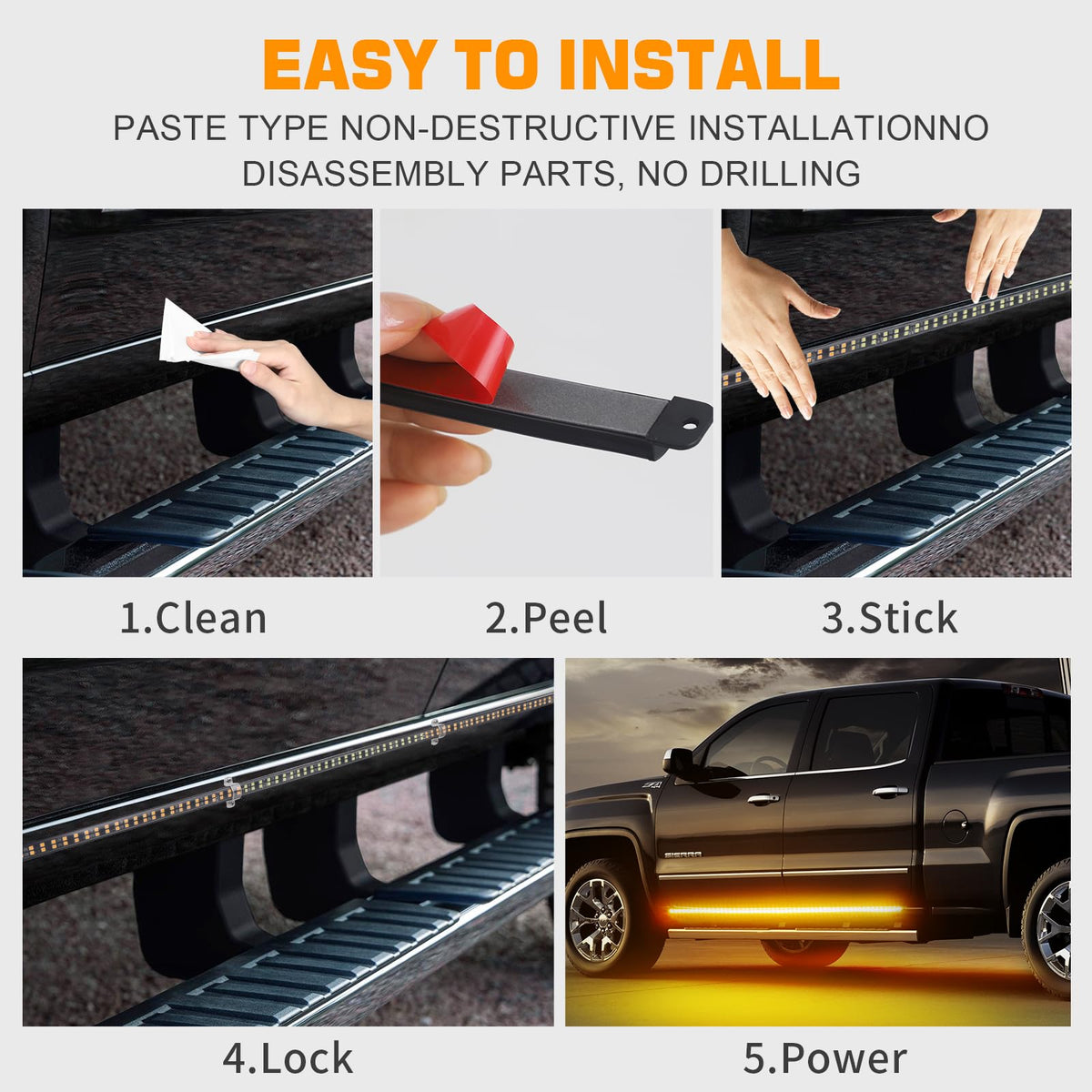 This amber Running Board emergency lights is equipped with 864 high brightness LEDs. Even during the daytime, the truck lights are bright and noticeable to the driver and effective for any warnings and emergencies.