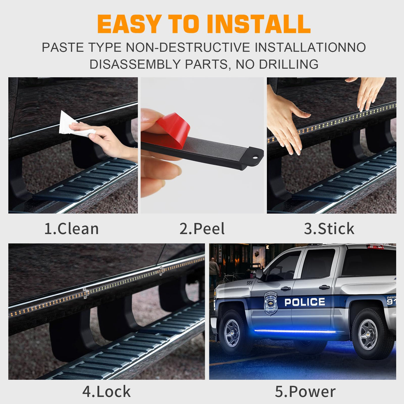 This blue Running Board emergency lights is equipped with 864 high brightness LEDs. Even during the daytime, the truck lights are bright and noticeable to the driver and effective for any warnings and emergencies.