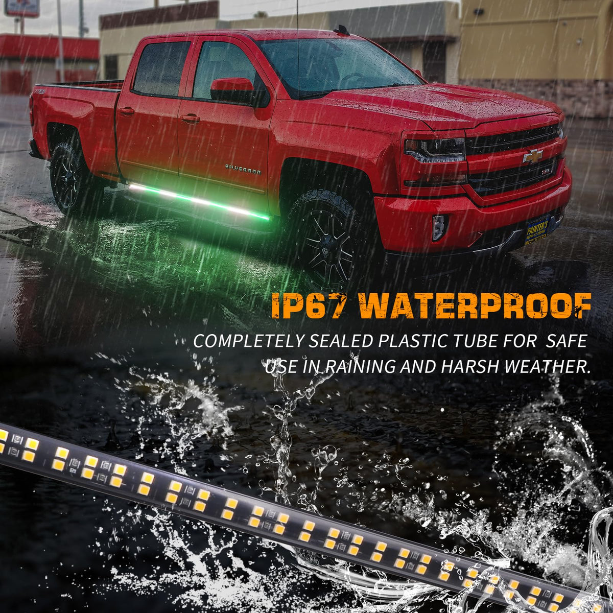 This green and white Running Board emergency lights is equipped with 864 high brightness LEDs. Even during the daytime, the truck lights are bright and noticeable to the driver and effective for any warnings and emergencies.