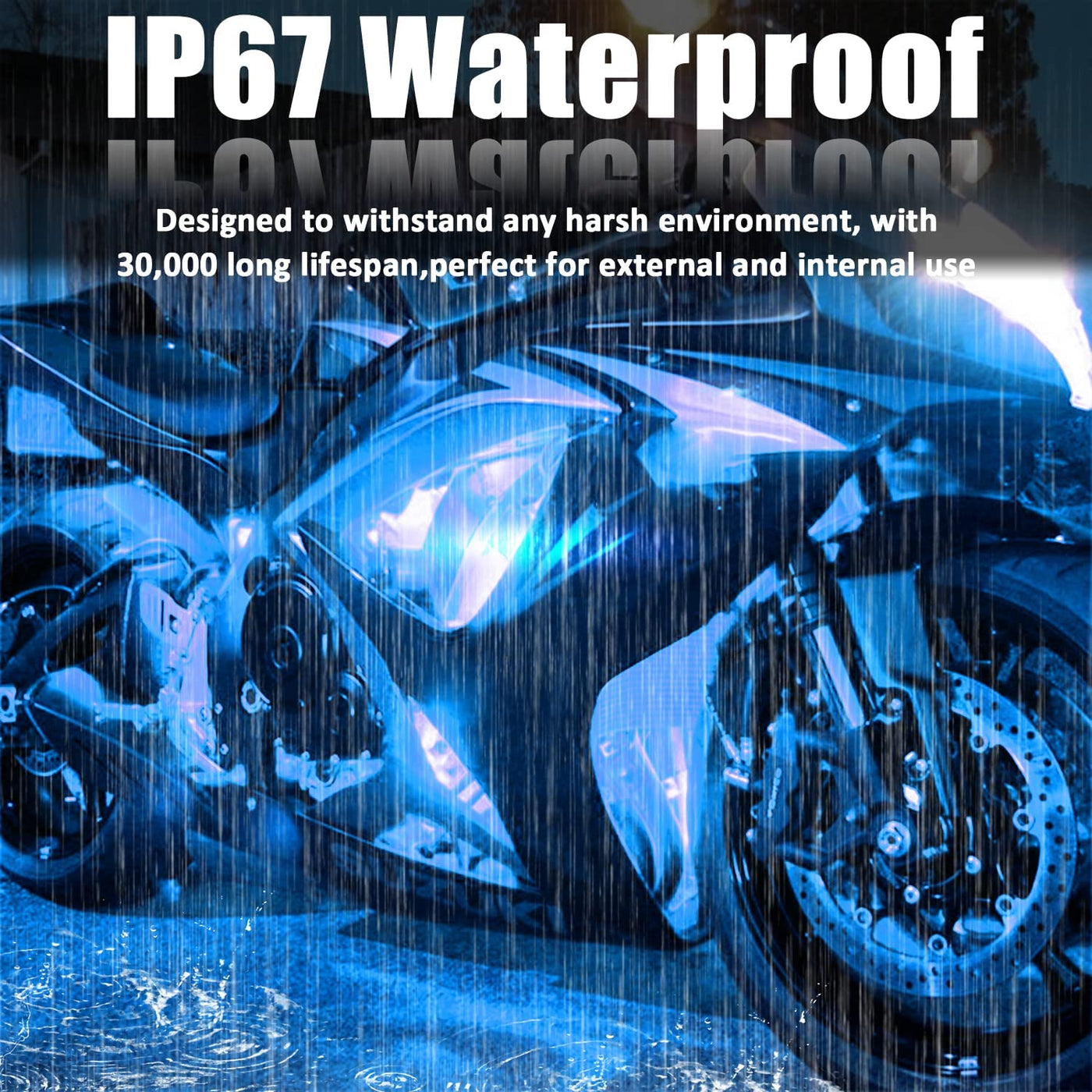 Q: What is the lifespan of the XT AUTO Ice Blue LED Strip Lights?A: The XT AUTO Ice Blue LED Strip Lights have a lifespan of approximately 30,000 hours, ensuring long-lasting performance for your lighting needs.