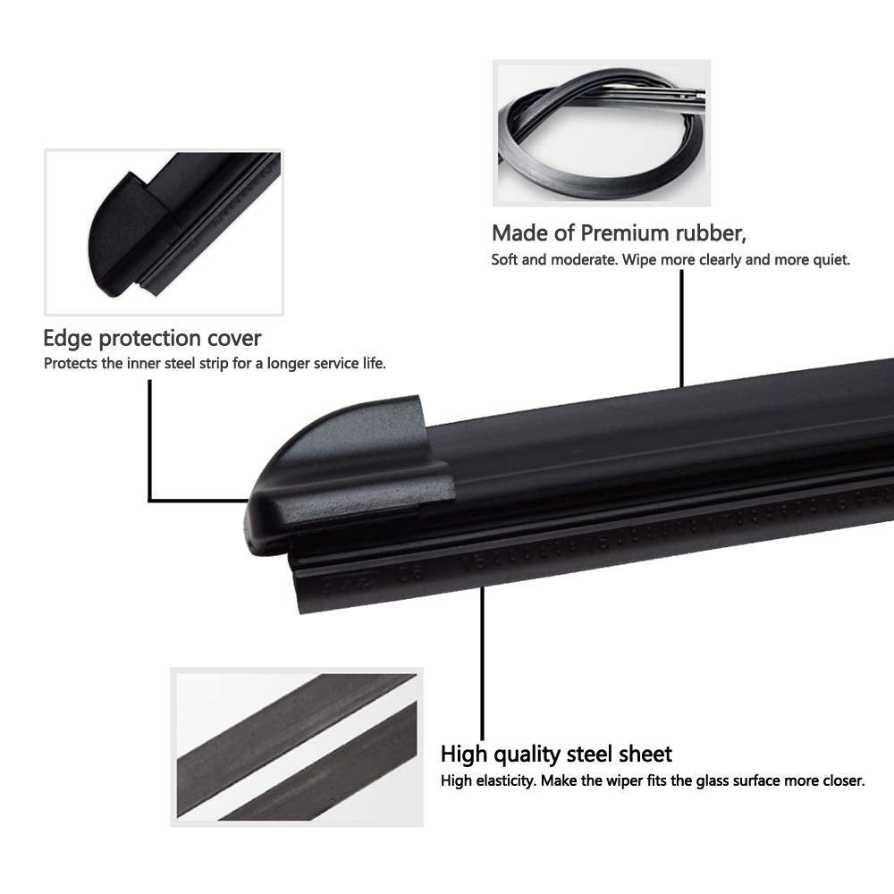 Wiper Features And Benefits Include: - Oem Replacement, Quality And Fitment Are Guaranteed - Durable Material Offers Longer Performance Life Over Other Conventional Wiper Blades - Specially Blended Rubber Delivers The Ultimate Smooth, Clean, Streak-Free And Chatter-Free Wipe - Flexible Spine Design Fits The Windshield Better, Providing Superior Windshield Contact - Aerodynamic Design Significantly Reduces Drag, Noise And Wind Lift - Bracketless Design Helps Prevents Snow And Ice Buildup How To Fix Common Windshield Wiper Problems Adjust The Tension On Your Blades By Manually Lifting The Wiper Blade Away From The Windshield Then Letting It Snap Back Onto The Windshield. Check For A Bent Wiper Arm By Stopping The Blades In The Mid-Stroke Position To See If The Wiper Arm Is Parallel To The Windshield Then Replace If Necessary. If The Blade Is Not Making Full Contact With The Windshield Take A Plier And Bend The Mid-To-Edge Section Of The Wiper Arm Downwards Toward The Windshield. Use Hot, Soapy Water And Clean Both The Windshield And Wiper Blade Rubber Thoroughly To Remove Any Grease Or Buildup.