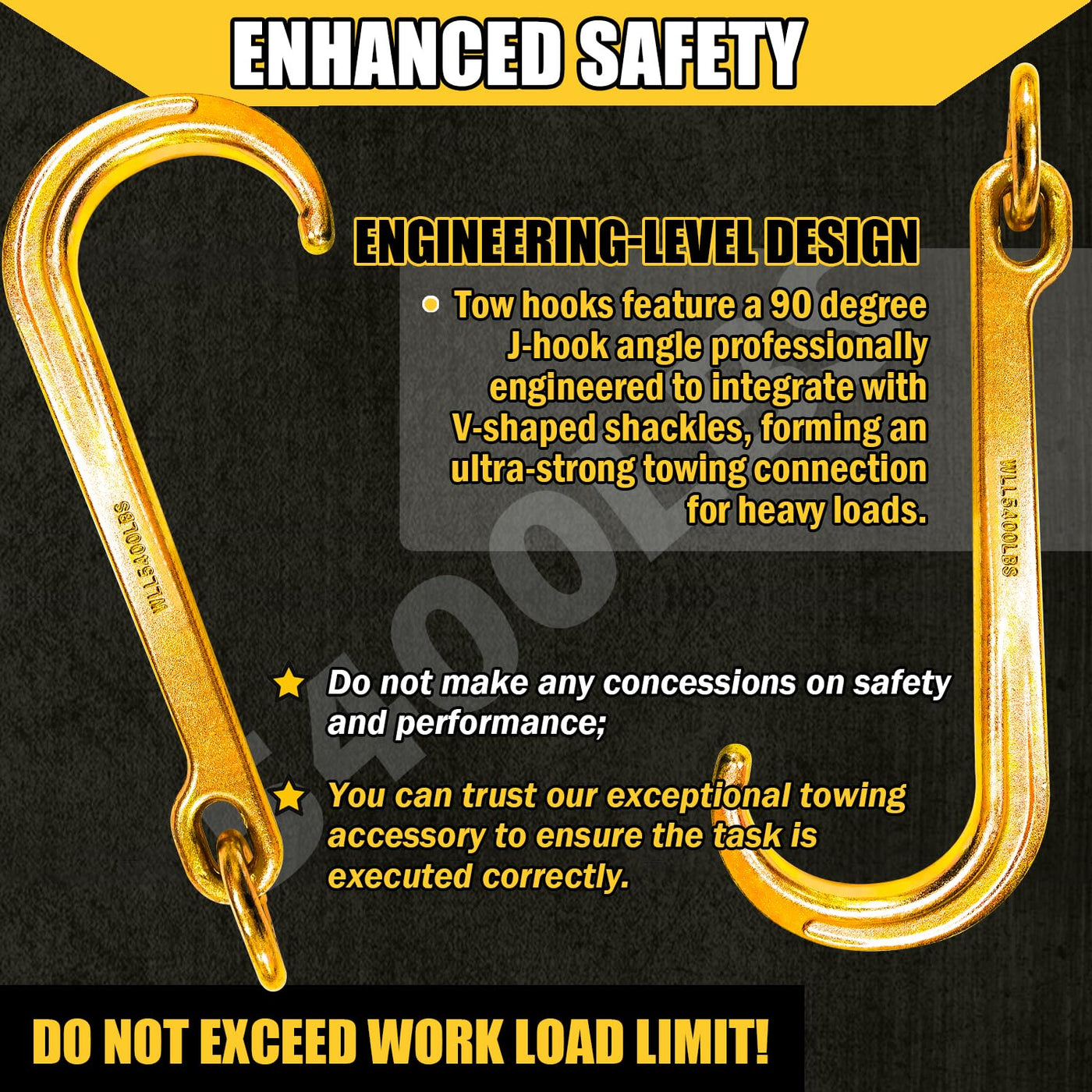 Q: What is the weight capacity of the YATOINTO J hooks?A: The YATOINTO Pair of 15" J Hooks is rated for a working load limit of up to 5,400 pounds, making them suitable for heavy-duty towing tasks.