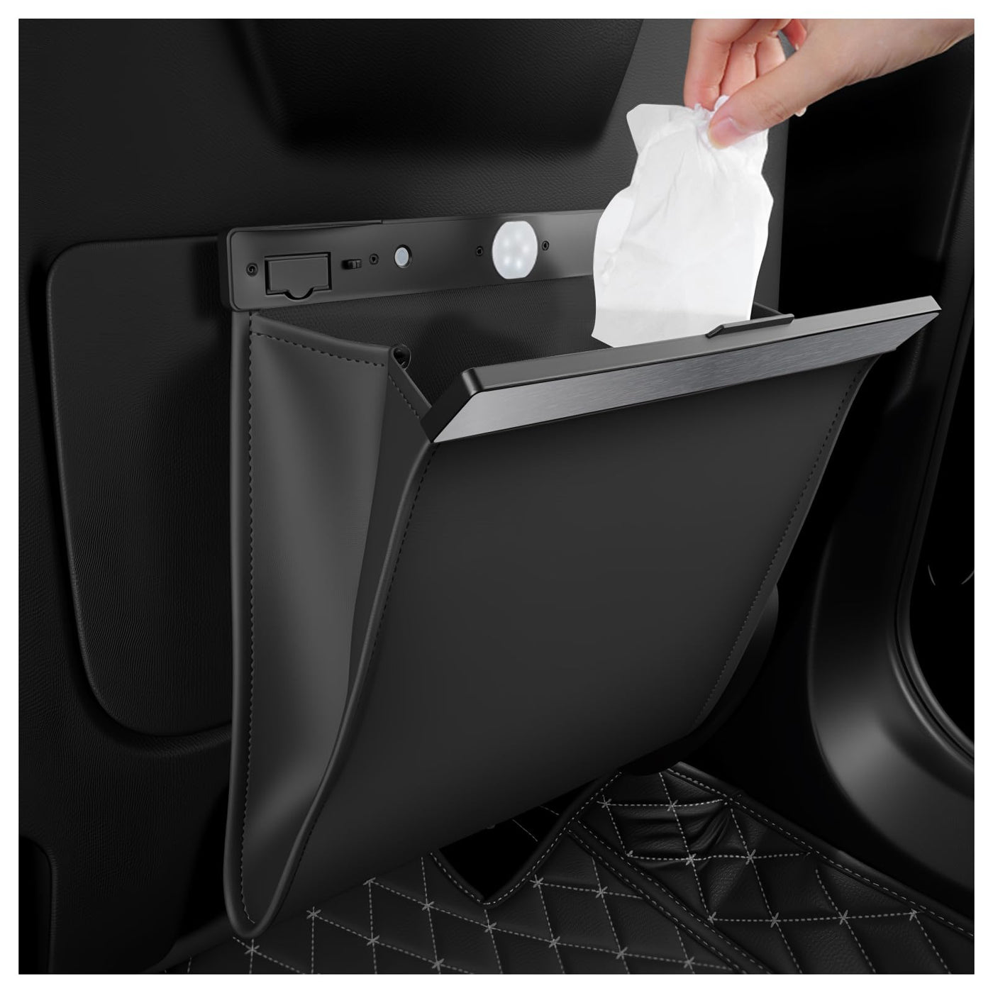 LED CAR TRASH CAN, EASY TO USE AT NIGHT, PUT GARBAGE AND ITEM STORAGE, STRONG MAGNETIC AND LEAK-PROOF, A GOOD CHOICE FOR DRIVING TRIPS Product Attributes Colors: Black Sizes: 11.61*11.02 inch Weight: 8.37 oz Material: PU Packaging: 1*Car Trash Can, 1 Roll Car Trash Bag (12pcs), 2*Hooks Product Feature & Functions 1. Designed with smart LED light, more convenient to use at night and reminds you that car trash can is not closed, comfortable using experience 2. Designed with strong magnetic, can be closed quickly, effectively avoiding the spread of odors, avoiding spillage and keeping the air in car fresh 3. Large capacity, can be used to store phones, keys, snacks, childrens toys, etc, easy to take out and use at any time, a good choice for driving trips 4. Made of PU leather, not easy to break and damage, easy to clean and maintain, keep long-term stable use, the package includes sufficient of garbage bags, for replacement