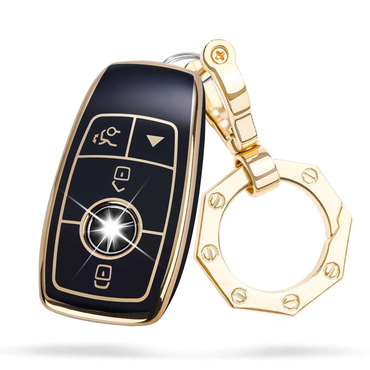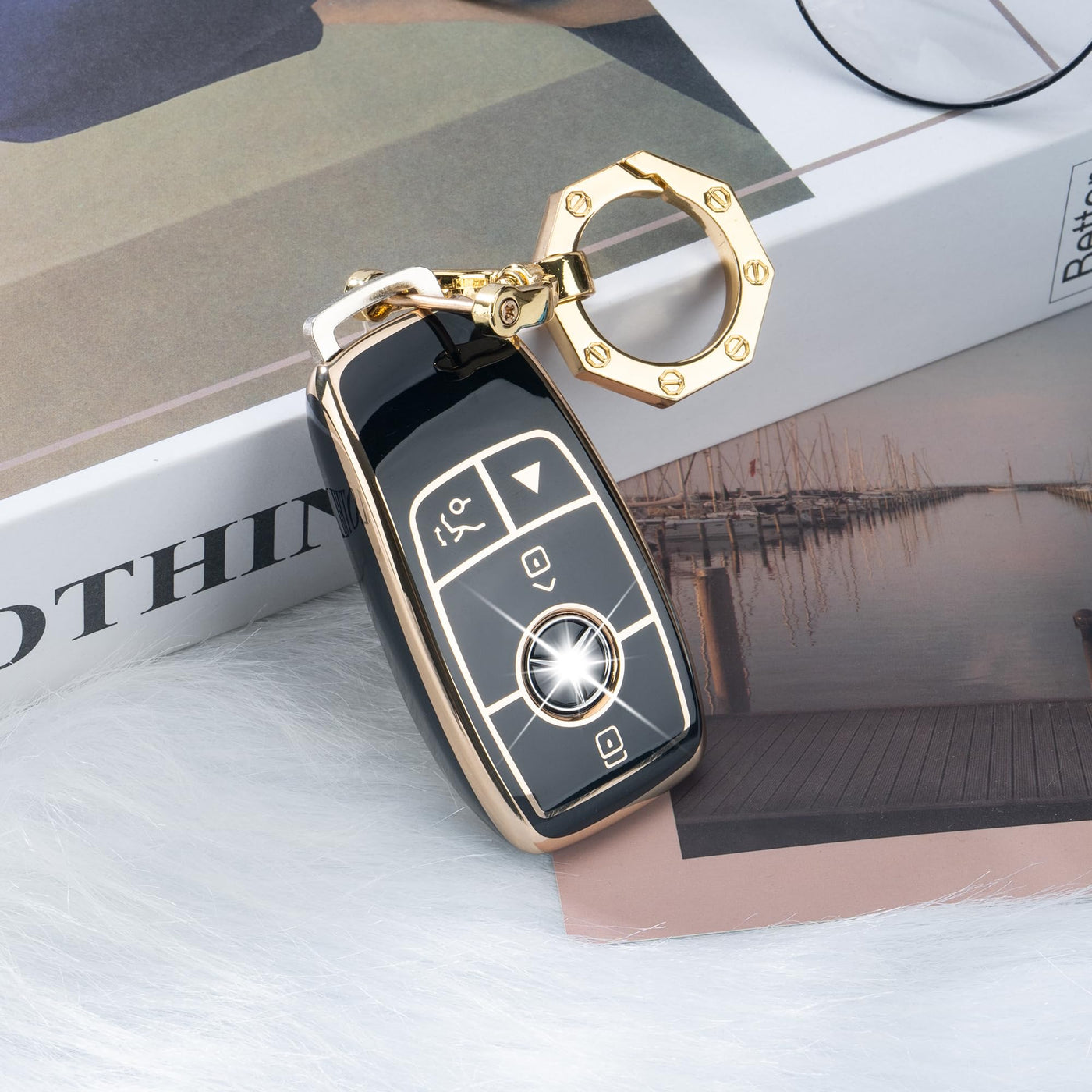Yhc For Mercedes Benz Key Fob Cover Car Key Case Shell With Gold Keychain Fit E S A C G Class 2017-2024(Black)