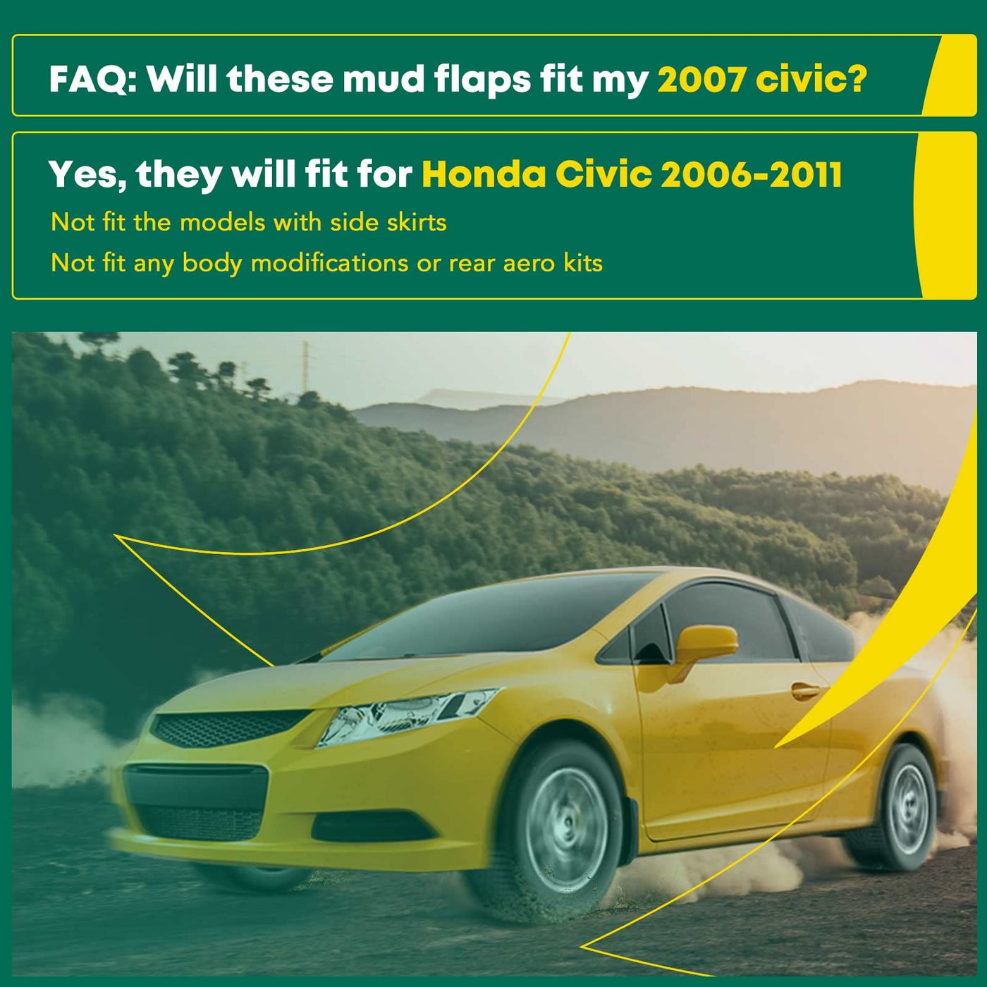 Q: Are these mud flaps compatible with all Honda Civic models?A: These mud flaps are specifically designed to fit Honda Civic sedan models from 2006 to 2011. They do not fit models with side skirts, any body modifications, or European Civic hatchbacks.
