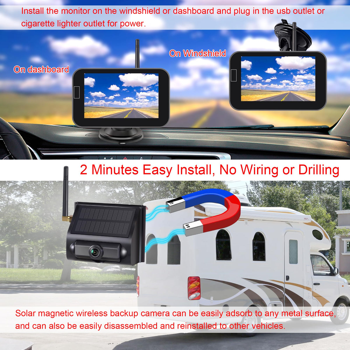 Upgrade Your Driving Experience With This Solar Magnetic Wireless Backup Camera For Truck, Trailers And Hitches. Designed For Effortless Installation In Just 2 Minutes, This Portable And Cordless Camera Requires No Wiring, Making It A Hassle-Free Solution. The 1080P Hd Rechargeable Camera And 7-Inch Monitor Provide A Crystal-Clear Rearview, Ensuring Maximum Visibility And Safety While Reversing Or Hitching. With Its Scratch-Proof Surface And Wireless Magnetic Mounting, This Backup Camera Is Built To Withstand The Rigors Of Outdoor Use. Whether You'Re Maneuvering A Truck, Trailer, Or Rv, This Camera System Offers A Convenient And Reliable Way To Monitor Your Surroundings. Enjoy The Freedom Of Wireless Operation And The Peace Of Mind That Comes With Enhanced Visibility, All In A Compact And Easy-To-Use Package.