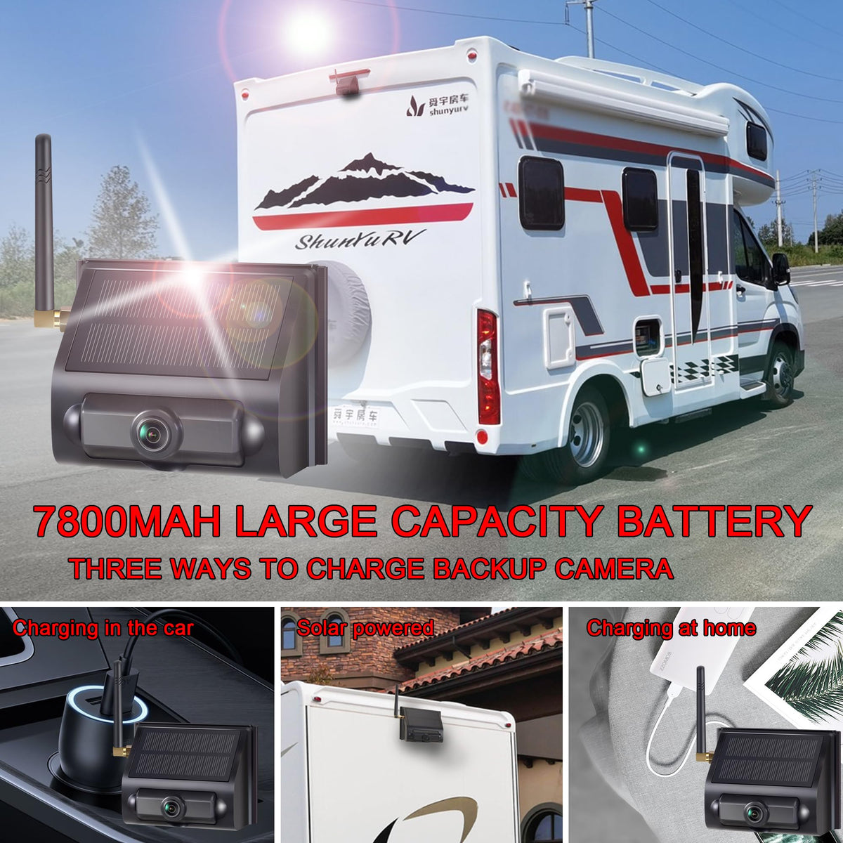 Q: Can the camera be charged using solar power?A: Yes, this backup camera comes with a solar charging panel, allowing it to charge whenever there is sunlight. Additionally, it can be charged via USB Type-C when solar power is insufficient, such as on cloudy or rainy days.