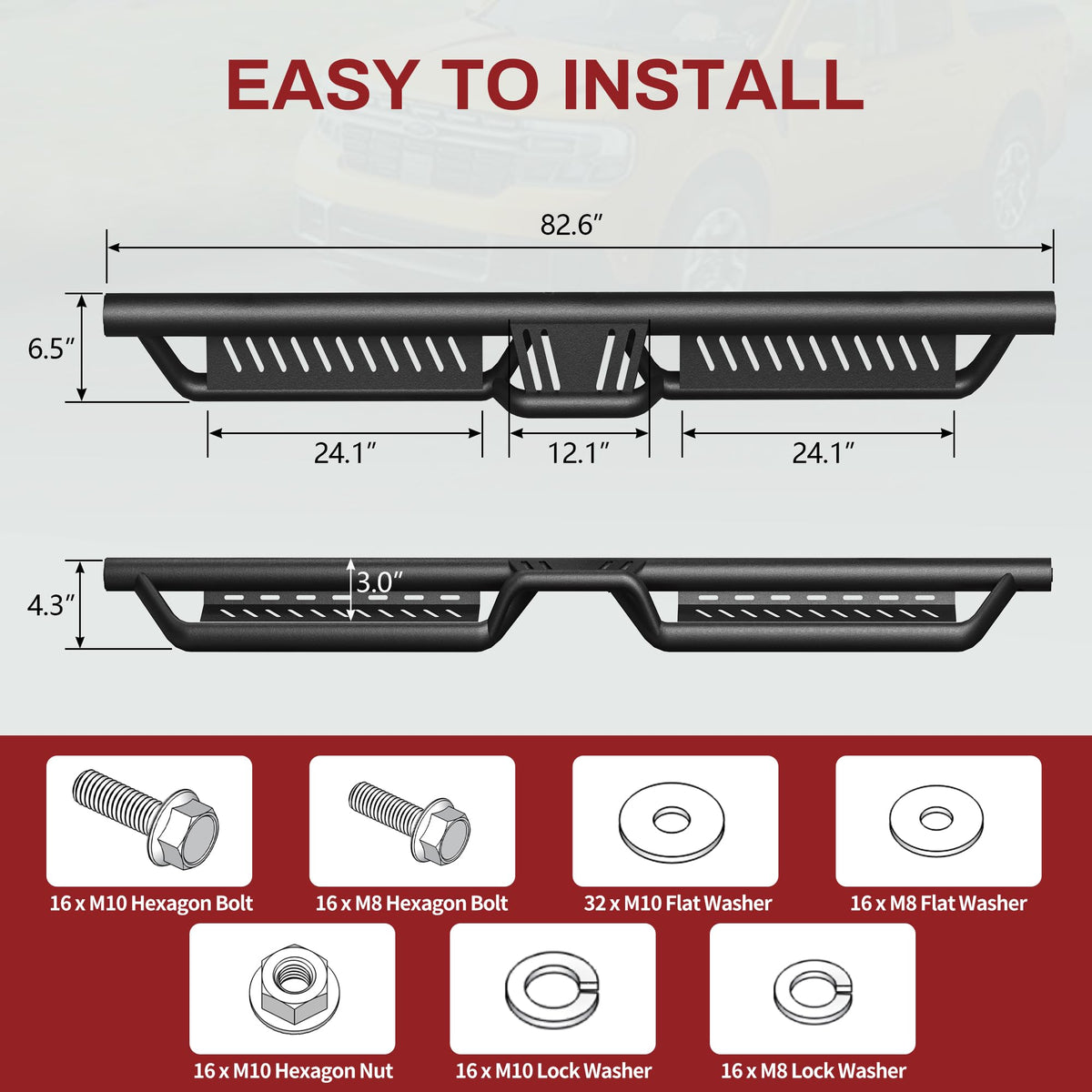 Easy Installation: YITAMOTOR running boards are compatible with 2019-2025 Chevy Silverado/GMC Sierra 1500 Crew Cab and 2020-2025 Silverado/Sierra 2500 3500 HD; Designed for a hassle-free, no-drill installation | Two-Stair Layout: Designed with a unique two-stair layout, these running boards provide easy access to your vehicle for all ages; The raised center step offers convenience for placing luggage or items on the roof | Heavy-Duty Carbon Steel: Made with high-quality carbon steel, these YITAMOTOR running boards can support up to 550 LBS; They are sturdy, durable, and resistant to deformation | Non-Slip Design: The hollow design prevents water and sediment accumulation, keeping the running boards dry and clean; This feature enhances safety and durability by reducing the risk of slipping | Weather Resistant: The surface is covered with a dual-stage textured black powder that can withstand heavy rain and snowstorms; This offers exceptional rust and corrosion resistance