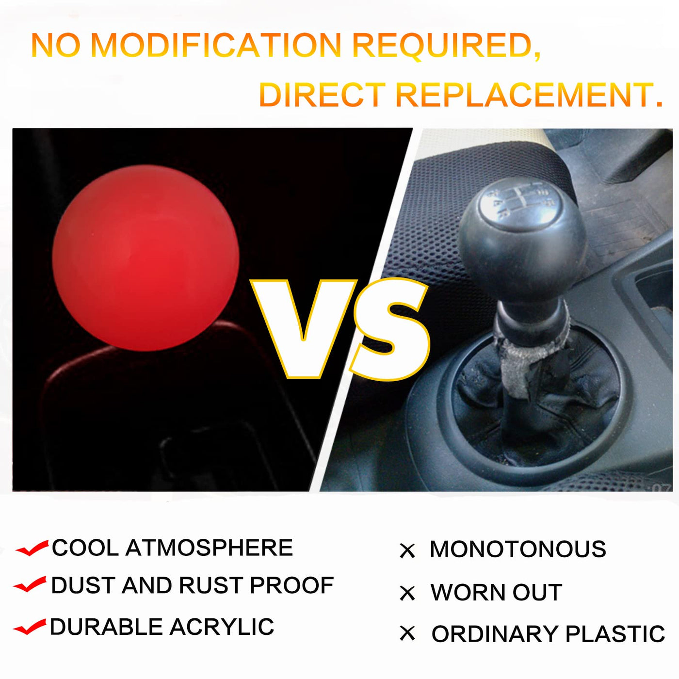 Specifications: Material: acrylic and aluminum alloy Style: Luminous Color: pink (when the light is bright) or red (when it is dark). Shift knob OD: 5.4 CM(2.13'') Package Contents:1*shift knob(M12*1.25), 3 adapters (M8*1.25, M10*1.25, M10*1.5) Installation steps: 1. Remove the original gear shift knob head of your car. 2. Compare and choose the appropriate size of shift knob adapter. 3. Connect the adapter and the shift knob head. 4. Screw the new gear shift head into the shift stick lever appropriately. (don't tighten it too hard) Note: 1. Make sure your original stick shifter is removable. 2. Not for the original car shifter with its own irremovable lock/function button. 3. Not for vehicles that need to lift the shifter(manual) or pressing a button/lock (automatic) on it when reversing. 4. Cannot be installed for those cars with the reverse gear next to the 1st gear.