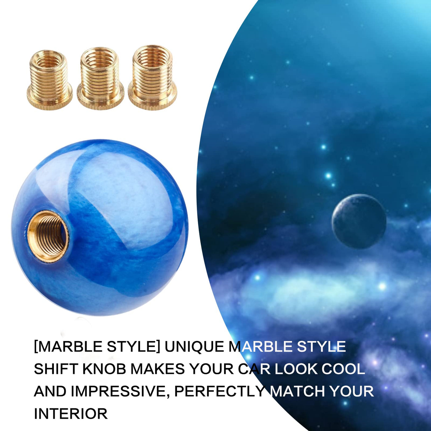 Specifications: Material: acrylic and aluminum alloy Style: Marble Color: Dark Blue Shift knob OD: 5.4 CM(2.13'') Package Contents:1*shift knob(M12*1.25), 3 adapters (M8*1.25, M10*1.25, M10*1.5) Installation steps: 1. Remove the original gear shift knob head of your car. 2. Compare and choose the appropriate size of shift knob adapter. 3. Connect the adapter and the shift knob head. 4. Screw the new gear shift head into the shift stick lever appropriately. (don't tighten it too hard) Note: 1. Make sure your original stick shifter is removable. 2. Not for the original car shifter with its own irremovable lock/function button. 3. Not for vehicles that need to lift the shifter(manual) or pressing a button/lock (automatic) on it when reversing. 4. Cannot be installed for those cars with the reverse gear next to the 1st gear.