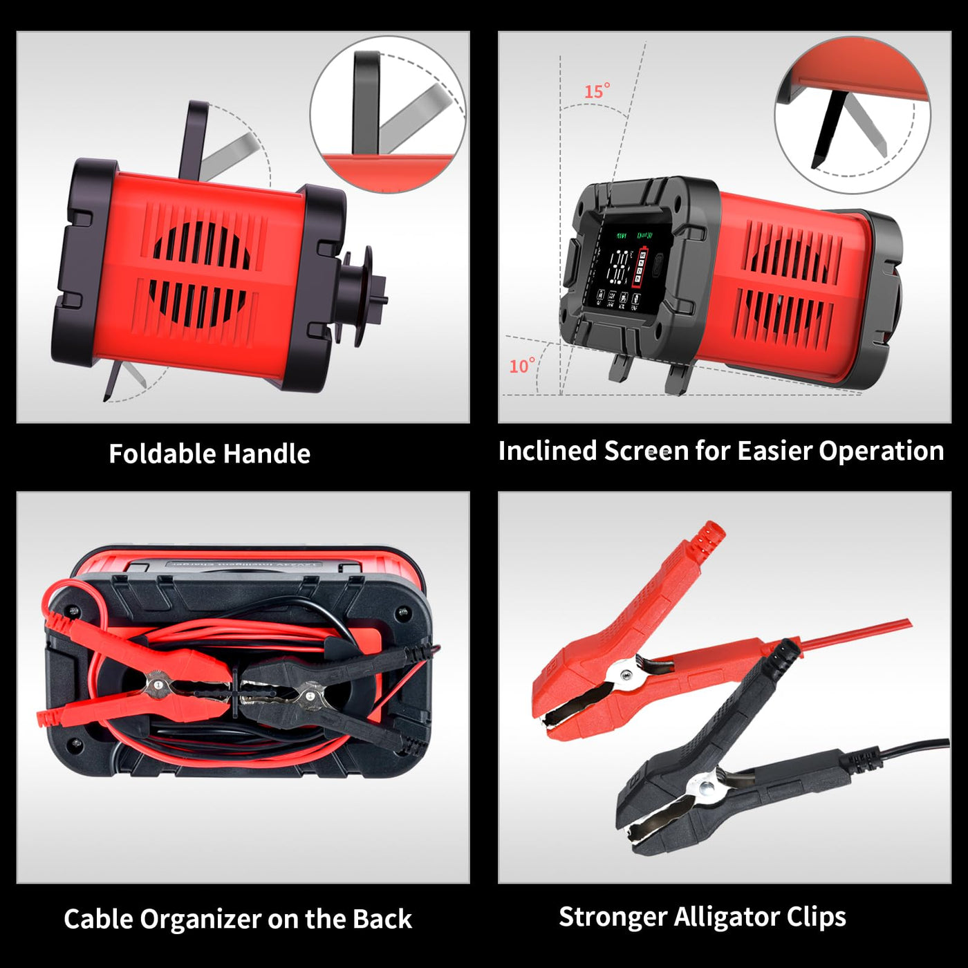Upgrade your car battery charging experience with our 12V/24V Car Battery Charger, featuring a Super Large Display Screen, Portable Storage Design, and 8 Charging Protections to extend your battery life. Our advanced charger is designed for universal compatibility, supporting 12V and 24V lead-acid batteries, including AGM, GEL, and WET batteries. The intelligent microprocessor-controlled charging process ensures optimal and safe charging while maintaining your battery's health. With clips on both sides for neat storage and a clutter-free charging experience, this is the ultimate battery charger and maintainer for cars, motorcycles, ATVs, boats, lawnmowers, and more. Invest in a reliable and efficient charging solution for your vehicle's battery today.
