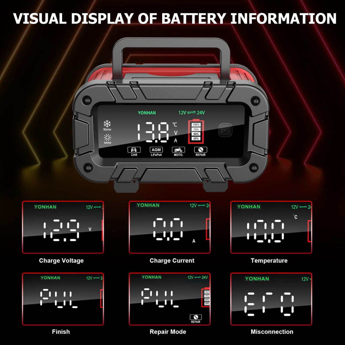 YONHAN Battery Charger 10 Amp, Upgraded 12V/24V LiFePO4 Lead Acid Portable Car Battery Charger w/Large Display Screen, Fully-Aut