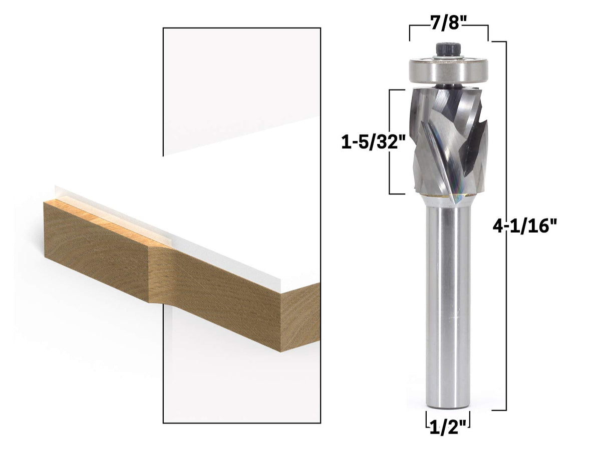 This Bottom Bearing Ultra-Perfomance Compression Flush Trim Router Bit has a 1-1/8' cutting height and a 7/8' diameter with an overall length of 4-1/16' and a 1/2' shank.
