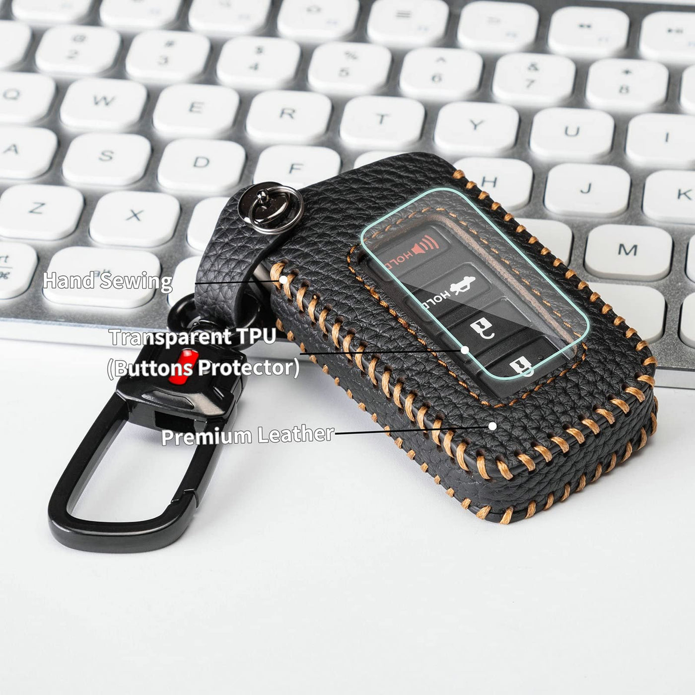 Q: What material is the YONUFI key fob cover made of?A: The YONUFI key fob cover is made of genuine premium cowhide leather, providing durability and full protection against scratches and damage to your key fob.
