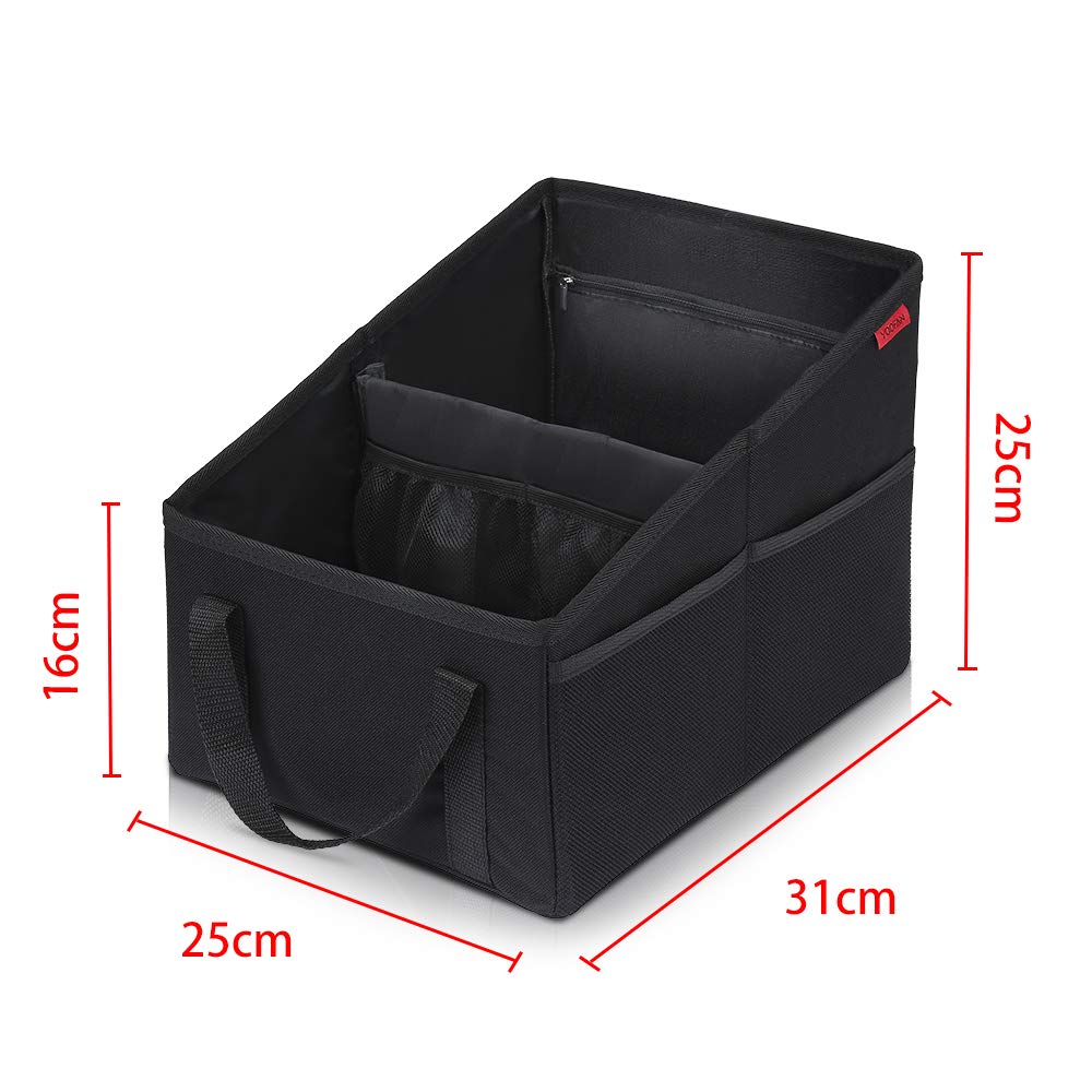 Would you like to have the clutter under control while driving necessities close at hand and avoid the interior of your car messy? Would you always want to have a hard time keeping your kids quiet and busy during a trip? YOOFAN car seat organizer is the best solution you've been looking for. We present this smart car seat organiser that will stop the mess in your car and have everything in one box - toys, snacks, drinks and other items. Also good for rubbish. For comfortable and stress-free driving. Features: Premium quality car seat organizer for adults and children. Stylish black design that will fit most car interior. Water-resistant, fabric for easy care and clean. 2 main compartments, 1 zippered pocket, 4 drink holders and 4 mesh pockets. Lightweight and easily portable container. Fold into a compact square within 2 seconds. Dual ergonomic handles for hassle free transportation and non-slip grip. Designed with a loop for seatbelt at rear to hold it in place and stop it from sliding. More Storage Space Car Seat Organiser YOOFAN B1 Car Seat Organiser bins is made of heavy duty Oxford cloth with strong stitched and high-strength plate. Size: 32 x 25 x 25 cm ( 12.6 x 9.84 x 9.84 inch) More storage space, large enough to keep all necessaries you need while traveling. Perfect for the front seat to organize the driver's things and back seat to store kids' toys, tissues, pens, books,bottles and snacks vent etc. Keep Vehicle Tidy Simply and best solution to avoid messy back seats full of toys, spilled drinks and baby gear. With this car seat organiser, you can tidy the back and front seats of your vehicle within few seconds! Keep all essentials you need inside the foldable container while traveling. Enjoy elegant trip, happier and more relaxed.