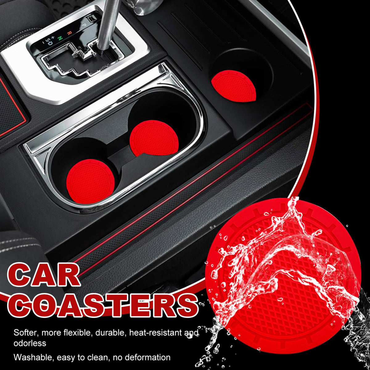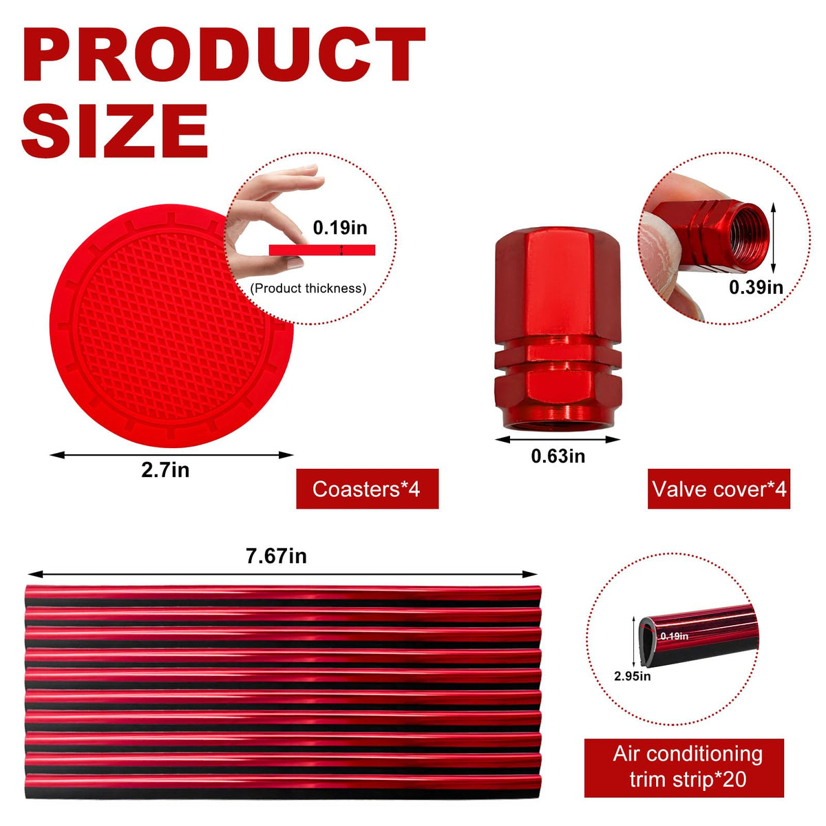 Specification: Material: ABS, PVC, Stainless Steels Quantity: 28 PCS Color: Red/ Blue/ Purple/ Black Weight: 0.37 lb Air Conditioning Trim Strip Size: 7.67 2.95 inches Car Coasters Size: 2.7 2.7 0.19 inches Tire Valve Stem Cover Size: 0.39 0.63 inches Package Includes: 20 Air Conditioning Trim Strips, 4 Silicone Car Coasters, 4 Car Tire Valve Stem Covers Feature: Practical, Multifunctional, Durable Fit Type: Universal Fit More information about the product: -One package can provide you with 28 products to meet your different needs. -Their surface is easy to clean, just rinse with water, very convenient. -These beautiful car accessories will make your driving mood more pleasant as well.