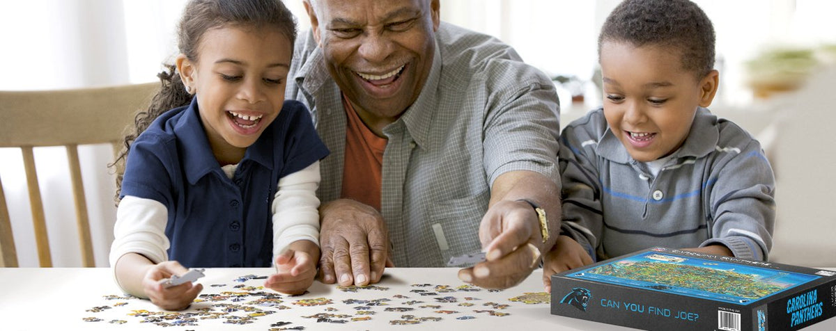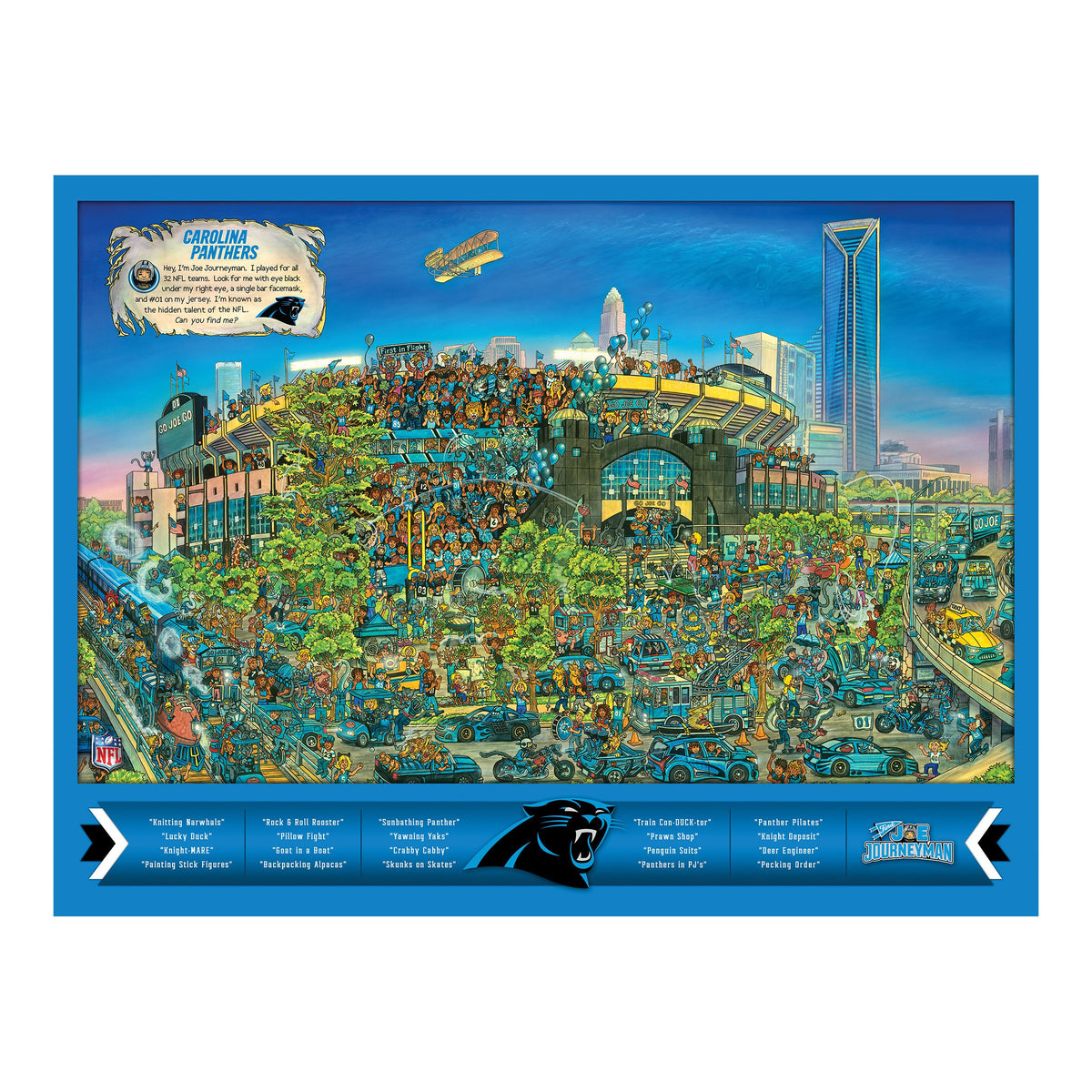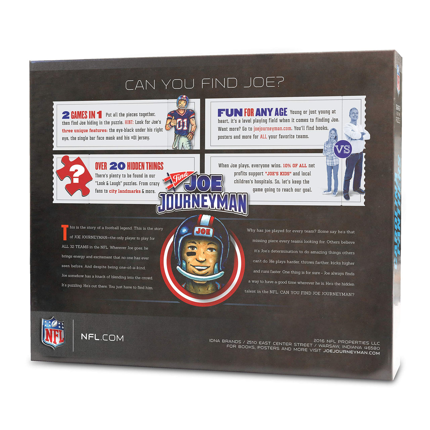First you have to put the puzzle together. Then you have to find Joe Journeyman - the only player to play for all 32 NFL teams - and discover dozens of laugh-out-loud scenes in these hand-drawn illustrations of NFL stadiums, their fans and their landmark surroundings. The seek and find adventure puzzle is officially licensed by the NFL for use by Joe Journeyman, a YouTheFan brand.