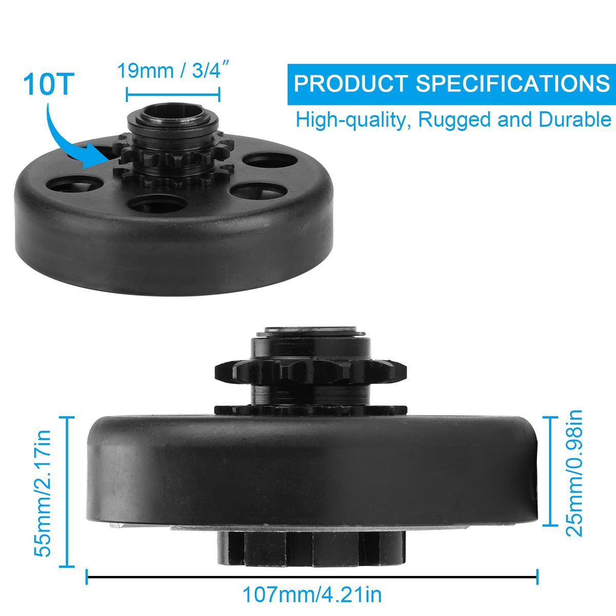 ???Features: ??Assembly compatible with Baja Mini Bike, for Baja Heat, for Mini Baja, for Baja Warrior. ??It is compatible with MB165 and the newer MB200 models. ??This item is also a perfect replacement part on much small utility 163cc 5.5 Hp and 196cc 6.5 Hp engines. ???Specification: Clutch Bore: 3/4'' Sprocket: 10 teeth with 3 Feet #40/41/420 chain Clutch Diameter: 107 mm Clutch Height: 55 mm Engagement Speed: 2300300 RPM Recommended Engine: 2 HP - 6.5 HP, 3/4'' shaft with flat key ???Fits: Fit 2-6.5hp for Honda Cloned Engines GC160, GC190, GX120, GX140, GX160, GX200 Perfect For Go Kart Minibike / for Baja MB165 & MB200 (Heat, Mini, Warrior) Common clutch for 3.5-7hp engines using #40/41/420 chain Fit for BS and 2 - 6.5 HP With 3/4'' Shaft fit for Tecumseh Engines 2 - 6.5 HP With 3/4'' Shaft ???Package: 1 x 10 teeth centrifugal clutch 1 x #40/41/420 chain 1 x Connecting link ???Oiling the clutch is extremely important Behind the snap ring, next to the sprocket teeth at the end of the clutch. There's an internal bronze bushing behind the snap ring that requires lubrication and it's up to you to put it there each time. It's a good idea to oil the chain at the same time. If the chain gets kinky from lack of oil it should be replaced before it damages the clutch sprocket. A new chain is cheaper than a new clutch. ??Note: The Centrifugal Clutch 3/4'' needs to be oiled before use. Before ordering please check your crankshaft size. Don't put oil inside the clutch holes