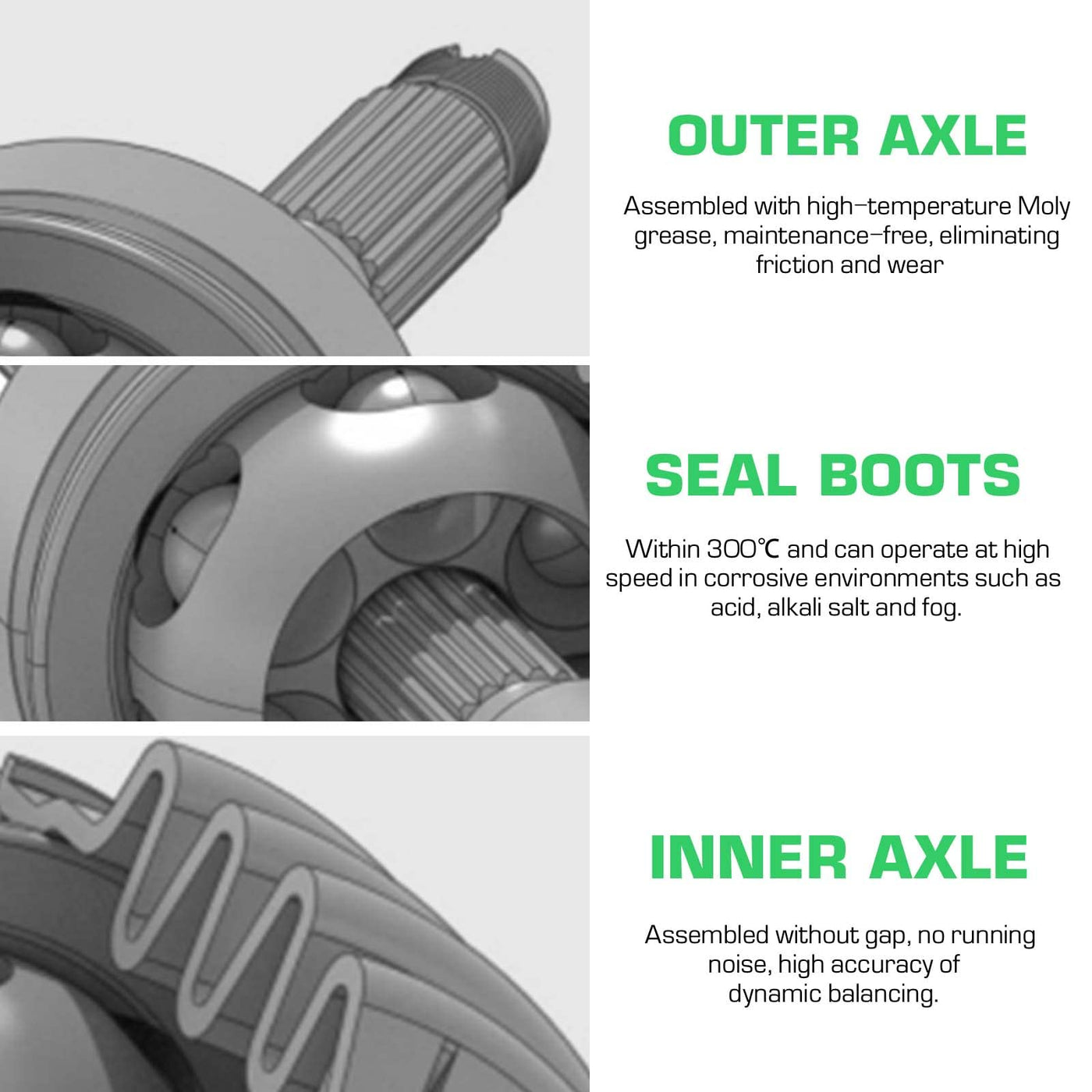 ???WHY CHOOSE Youxmoto ATV CV AXLES ? MATERIAL: Dual Heat Treated Chromoly Steel holds up better through extreme torque. WIDE ARTICULATION ANGLE: Wide articulation angles and an increase in plunge prevents the axle from binding. TPEE BOOTS: Our Thermoplastic Polyester Elastomar CV boots are highly resistant to tearing. HASSLE-FREE PURCHASE: We offer fast response within 8 hours; 2 years return service. ???FEATURES OF CV AXLE: Made Up of 4340 Chromoly Material. 10% - 15% Increase in CV Joint Size Compared to Regular Joints. Boots Packed with High Load Molybdenum Grease. Position: Front Left/Right Replaces Part number # 1333123, 1333283, 1333420, 1334308 ???FITMENTS OF CV AXLE: Fit For Polaris RZR XP 1000 - 2020 2021 Fit For Polaris RZR XP 1000 Premium - 2022 Fit For Polaris RZR XP 1000 EPS - 2014-2019 Fit For Polaris RZR XP 1000 EPS Desert Edition - 2015 Fit For Polaris RZR XP 1000 EPS High Lifter Edition - 2015 2016 Fit For Polaris RZR XP 1000 EPS DYNAMIX Edition - 2019 Fit For Polaris RZR XP 1000 EPS Ride Command Edition - 2018 2019 Fit For Polaris RZR XP 4 1000 - 2020 2021 Fit For Polaris RZR XP 4 1000 Premium - 2022 Fit For Polaris RZR XP 4 1000 Sport - 2022 Fit For Polaris RZR XP 4 1000 EPS - 2014-2019 Fit For Polaris RZR XP 4 1000 EPS DYNAMIX Edition - 2019 Fit For Polaris RZR XP 4 1000 EPS Ride Command Edition - 2018 2019 ???Package: 2 Front CV AXLE ??Please check the fitment above to see if your vehicle fits!