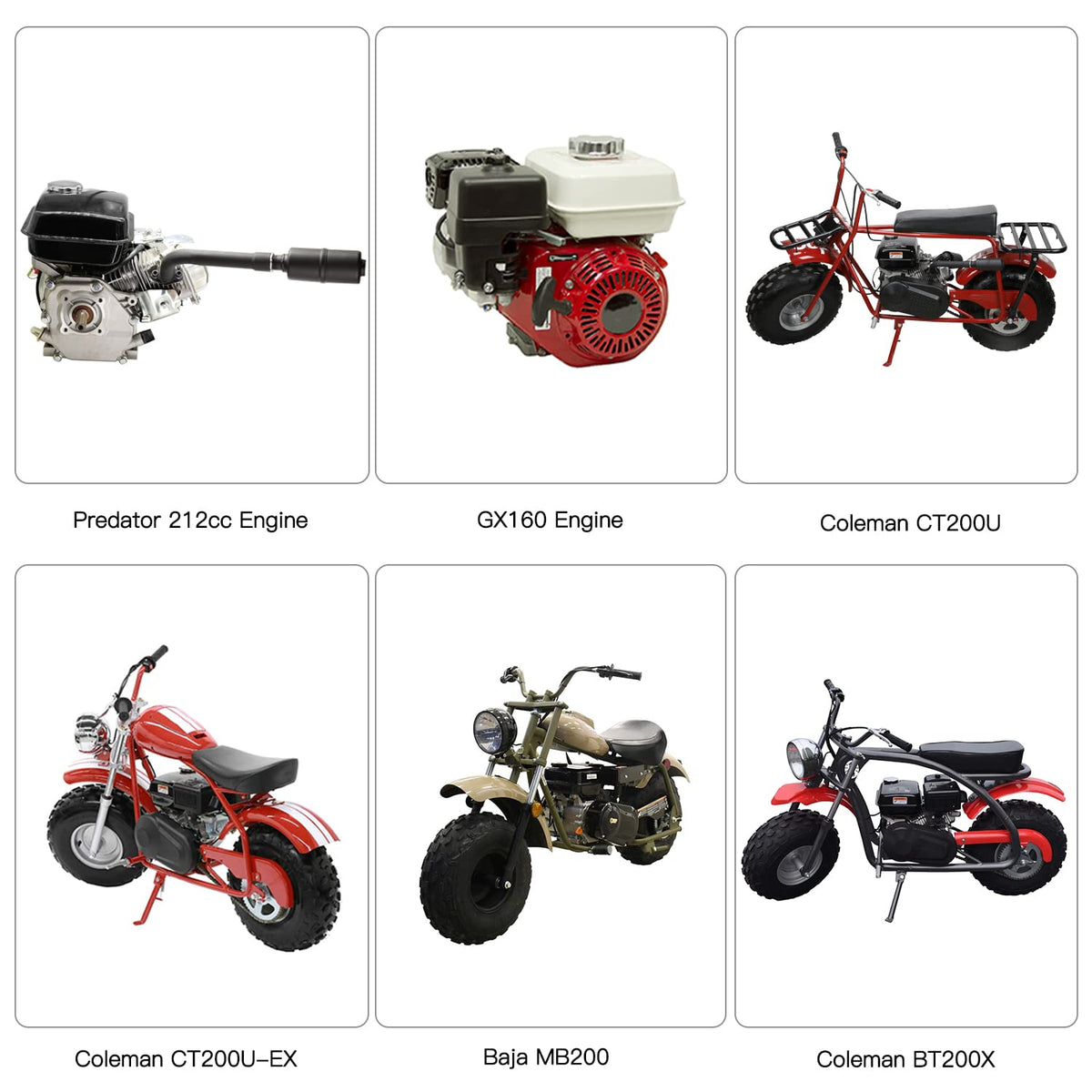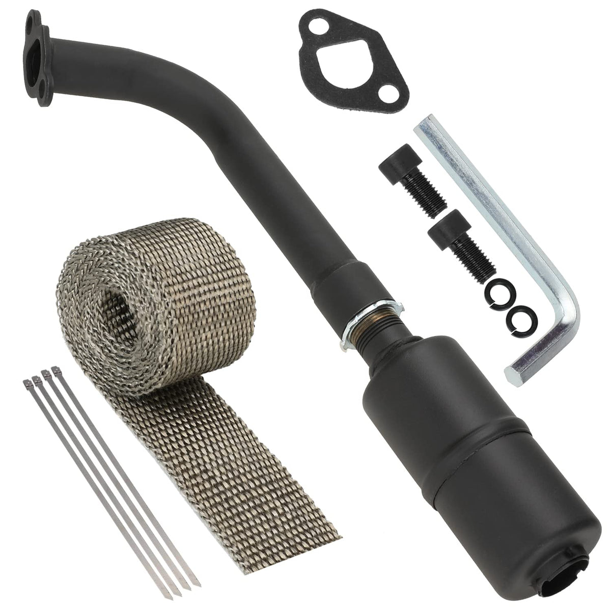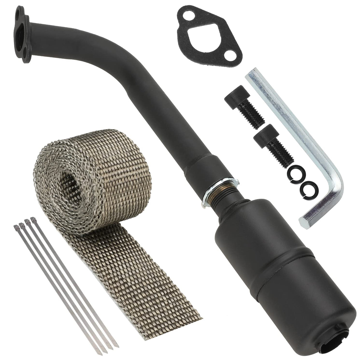 YOXUFA Upgraded Exhaust Header Pipe Muffler with Heat Shield Tape for Predator 212cc Coleman CT200U CT200U-EX GX160 GX200 Baja Warrior Massimo MB200 196cc 6.5hp Hammerhead Mini Bike Go Kart Parts. Product details Features: fit for Hemi Non Predator 212cc Coleman Baja Massimo Trailmaster Mini Bike Go Kart Motor Water Pump Pressure Washer and Other Equipment Clone OHV Small Engine. Compatibility: Predator Hemi / Non-Hemi 212cc Engine, Hond* GX200 6.5HP GX160 5.5HP OHV engine, Coleman CT200U / CT200U-EX / BT200X / KT196, Baja Warrior Heat MB165 / MB200, Hensim Mini Bike MB165 & MB200 (Heat, Mini Baja, Warrior), MASSIMO MB200, Mid Xrx,Xrx-R,Blazer 200-R, Hammerhead 80T Mini Shark go kart, Tomberlin Firehawk 6.0 Hp Mini Bike, Motovox MBX20, TrailMaster 196 MB200-1,MB200-2 Mid Go Kart, It's predator 212cc upgraded exhaust pipe muffler kit, replace the original exhaust ,engine breath smoother to improve power, add muffler to reduce noise, better sense of experience. We provide heat shield tape to protect your legs. NOTE-Please check the fitment and size of item carefully before purchasing. Specification: part name : Exhaust Muffler Kit Brand: YOXUFA Material: Metal Package Size: 22X30X6 cm / 9.055X11.8X2.36 in Package Weight: 0.734kg / 25.89oz Package List: 1 * Exhaust Pipe, 1 * Muffler, 1 * Heat Shield Tape, 2 * Gasket, 2 * Screws, 1 * Wrench, 4 * Ties,