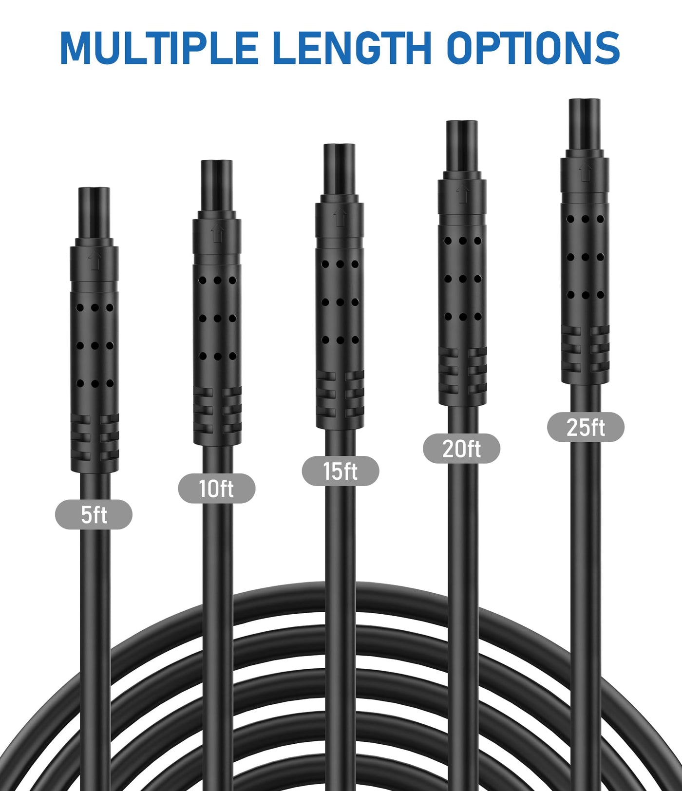 Q: What length options are available for the YQMAJIM 4Pin Backup Camera Extension Cable?A: The YQMAJIM 4Pin Backup Camera Extension Cable is available in several length options: 5ft, 10ft, 15ft, 20ft, and 25ft. Choosing the appropriate length is important for maintaining a stable signal.