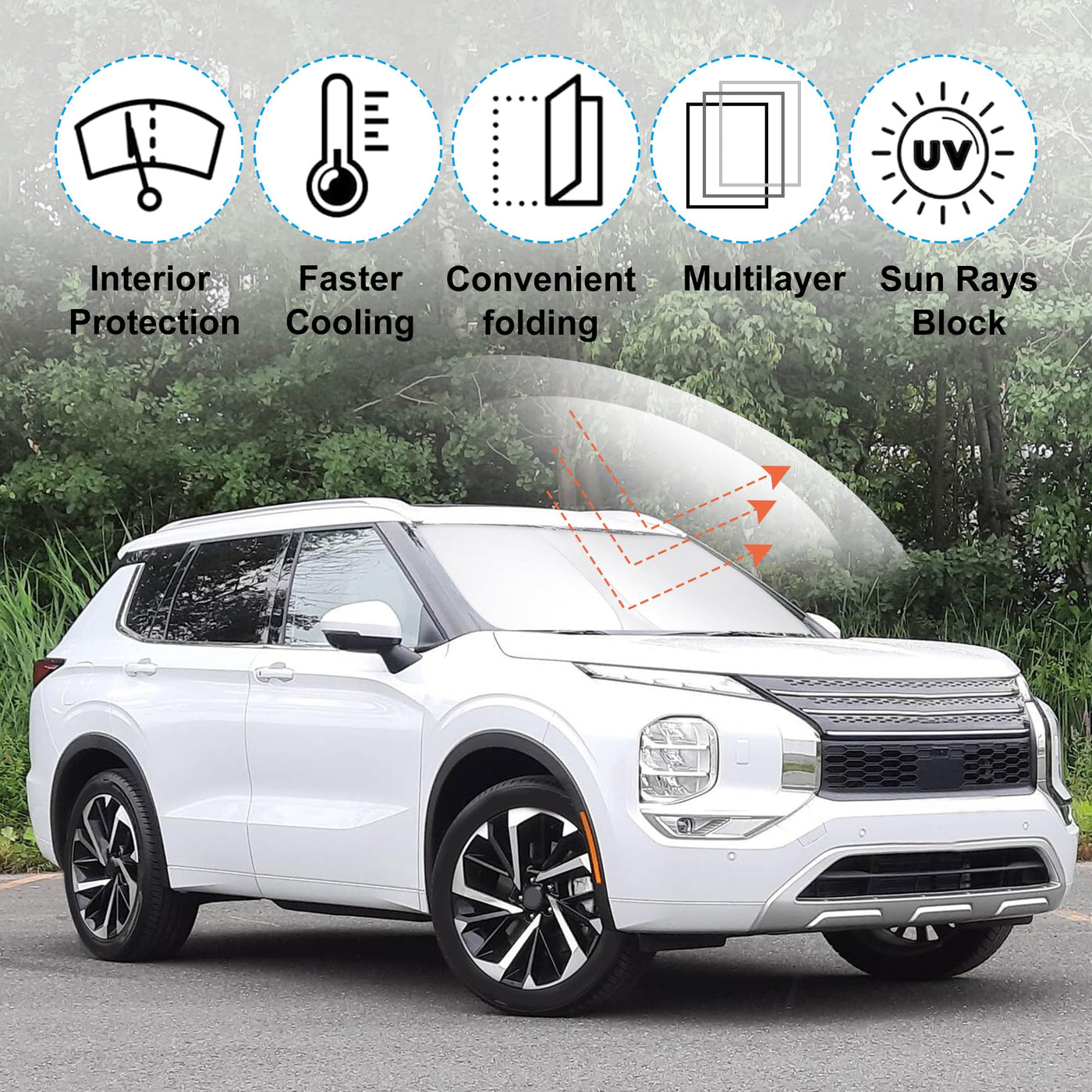 ?Vehicle Specific?YYCKE Windshield Sun Shade Accessories Compatible with 2022 2023 2024 2025(NO Outlander Sport) Outlander for Mitsubishi Foldable Sunshade Sun Visor Blocks UV, fully covering your windshield without any gap, achieving a 100% perfect fit. | ?Quality Assurance?Manufactured from Reflective Fabric with a higher density. The two-sided design incorporates black heat insulation layers and silver reflective layers, offering superior protection against the Sun, blocking up to 99% of damaging UV rays and heat build-up. (NOTE: The Sliver side should face outward, while the Black side should face inward.) | ?Air Conditioning Cools Faster?Instead of having to wait 15 minutes for your AC to cool off your car by consuming more energy and gas, using this product enables the AC to cool faster and more easily. It saves your money while making your driving experience in the Outlander for Mitsubishi much more comfortable and enjoyable. | ?Effective UV Protection?With this windscreen sun shade, it can safeguard the car interior from detrimental UV rays and heat that would cause the dashboard and seats to fade. Also, when you travel by car or need a nap, the YYCKE custom-fit Windshield Shades can block 99% of the sun shine and UV rays, providing more protection for you and your family. | ?More Convenient?With an accurate fit, you merely need to align and install. It is stable and does not shift. Due to its strong resilience and foldability, it is very easy to store.