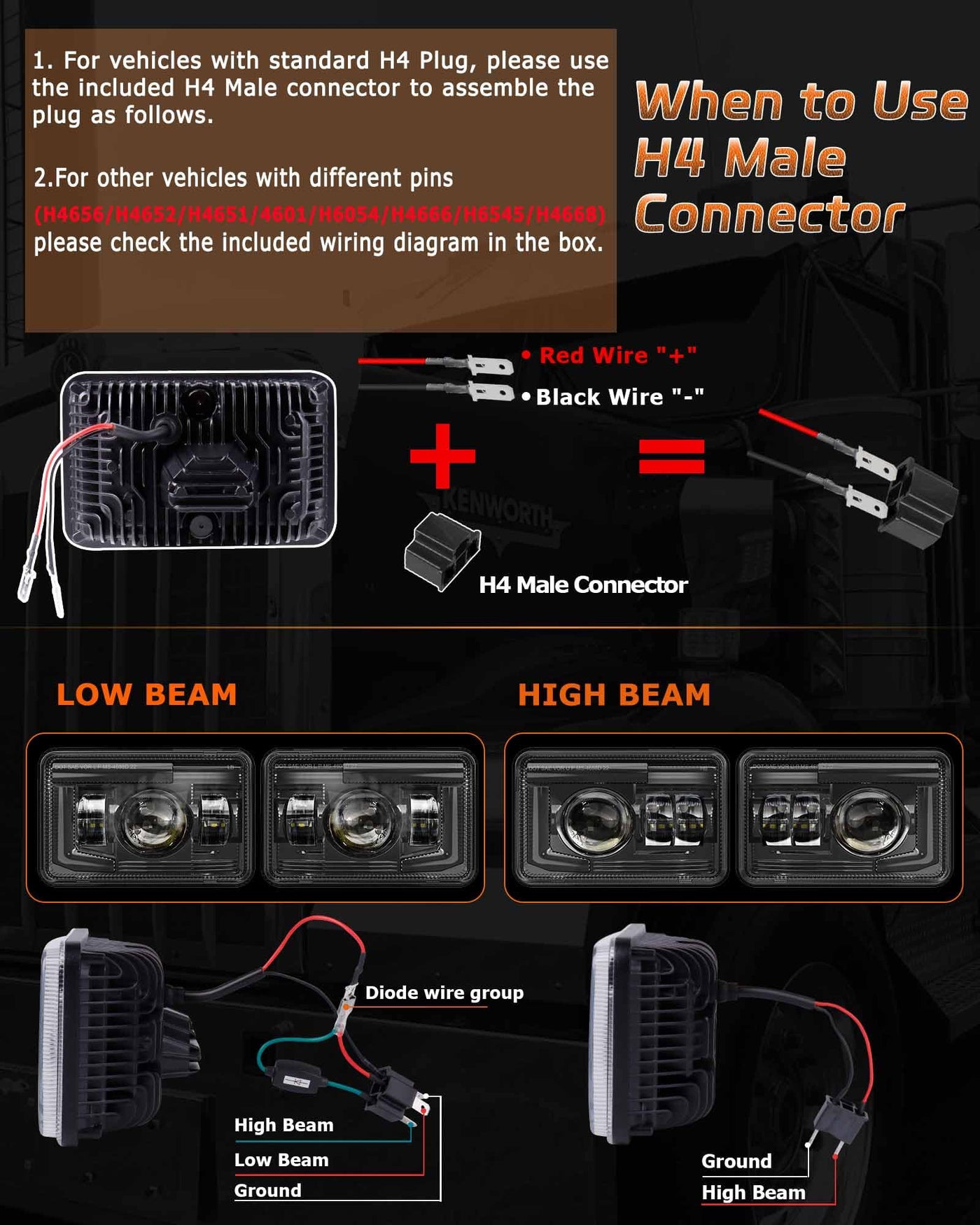 Package Included 2Xhigh Beam Headlights 2X Low Beam Headlights 1X Instructions 4X H4 Connectors Other Accessories