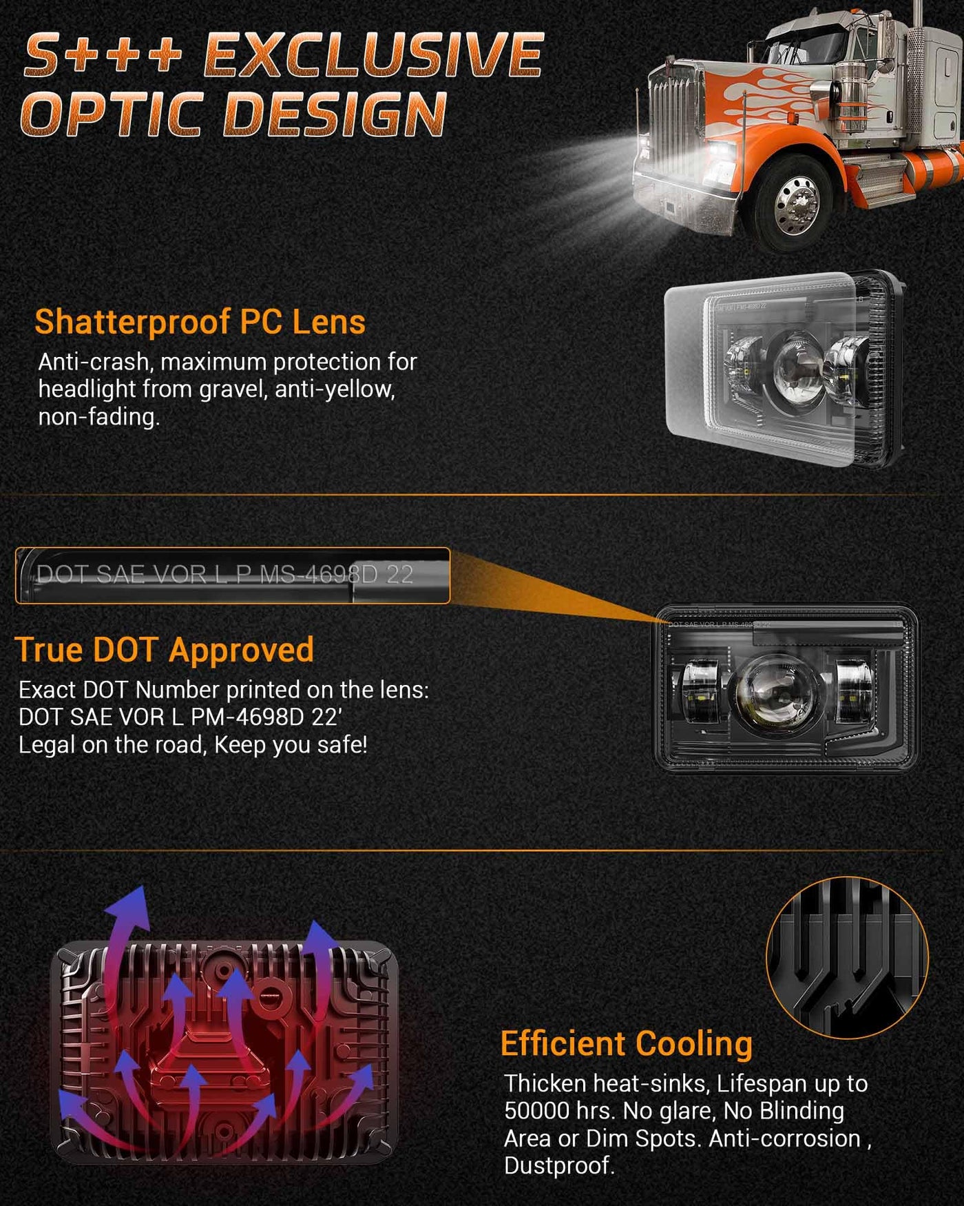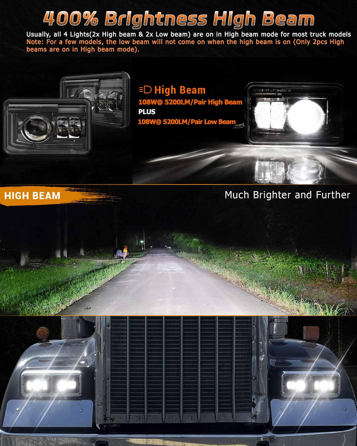 Outstanding Lighting Specifications 1.Led Chips: High Intensity Led Chips, 6500K Cold White Color Temperature 2.Power And Lumen: 108Watt@5200Lm/Pair For High Beam And 108Watt@5200Lm/Pair For Low Beam Note:Separate High/Low Single Beam Design(Low Beam On, 2 Lights Are On; High Beam On, All Of 4 Lights Are On.) 3.Material: Durable Pc Lens And Aluminum Alloy Housing 4.Item Dimension: 4.25' H X 6.61' W X 2.80' D 5. Ip67 Waterproof, More Than 50,000 Hrs Lifespan