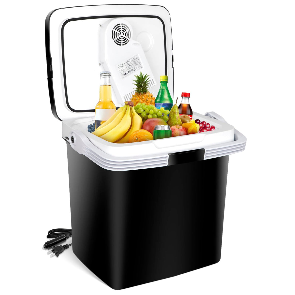 Specification: Color: Black Net Weight: 11.24 LBs Dimension External: 30 x 24 x 37.8 cm / 11.8 x 9.4 x 15'' Internal Size: 27 Liters/25.7 Quarts/7.18Gal Voltage: 110V(AC);12V(DC) Cord length: (AC) 6 Feet;(DC) 6.56 Feet Cooling: 57? below ambient temperature Heat preservation range: 122?-149? Environmental temperature of 30 ?: cooling power of about 50w, internal temperature of 16-17.5 ? Heating power of about 41w, internal temperature of 49.3-55.6 ? Energy consumption: A++ Package includes: 1 x Refrigerator 1 x DC Power Cord 1 x AC Adapter 1 x Manual Watts: 110V AC House - hot watts : 41w10%; cold watts: 50w10% 12V DC Car - hot watts : 50w; cold Watts : 40w