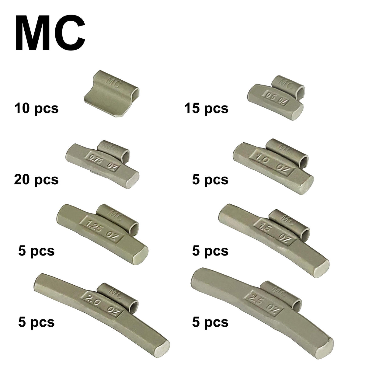 MC type For alloy wheels of Ford, Chrysler, GM van and light truck Grey 70pcs/kit: 1/4oz 10pcs, 1/2oz 20pcs, 3/4oz 15pcs, 1oz 5pcs, 1 1/4oz 5pcs, 1 1/2oz 5pcs, 2oz 5pcs and 2 1/2oz 5pcs Eco friendly, 50 state legal, zinc coated Steel tape weights. High zinc micron + epoxy double paint coating makes the best rust prevention possible.Suction film packaging to prevent and reduce delivery damage