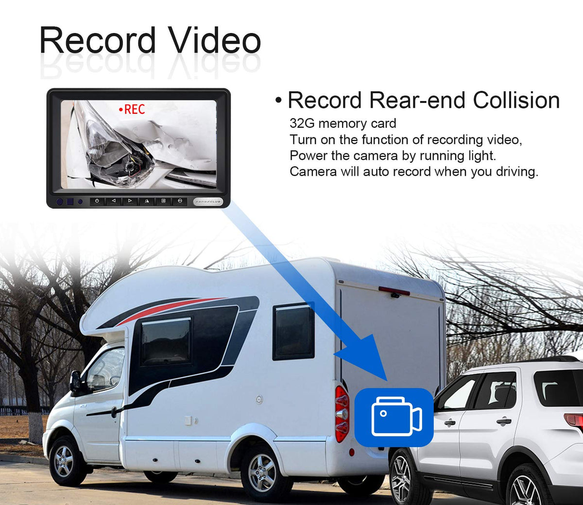 Q: Can I install the ZEROXCLUB backup camera system on different types of vehicles?A: Absolutely! This system is designed for versatility and can be installed on a wide range of large vehicles such as RVs, trucks, trailers, vans, and buses, accommodating a DC voltage range of 12-24V.
