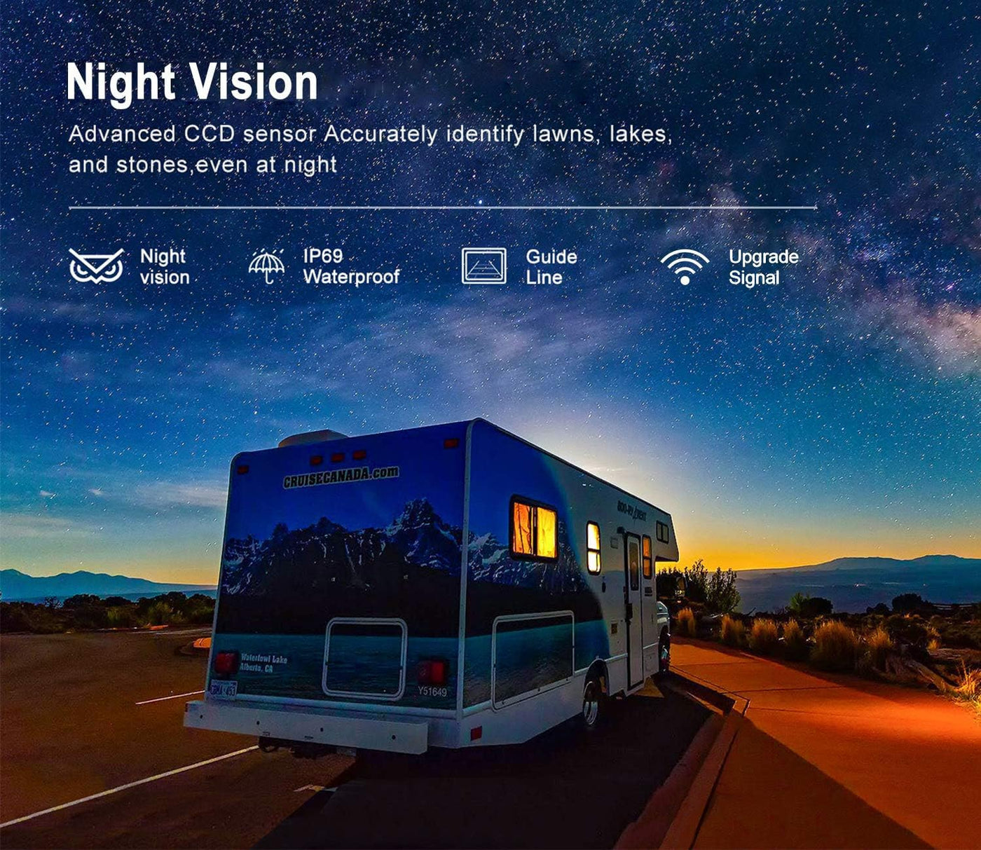 Q: What features enhance the night vision capability of the backup camera?A: The backup camera is equipped with a CCD sensor that provides clear and detailed images in low light conditions. This feature helps accurately identify obstacles and surroundings even in the dark, enhancing safety during nighttime driving.