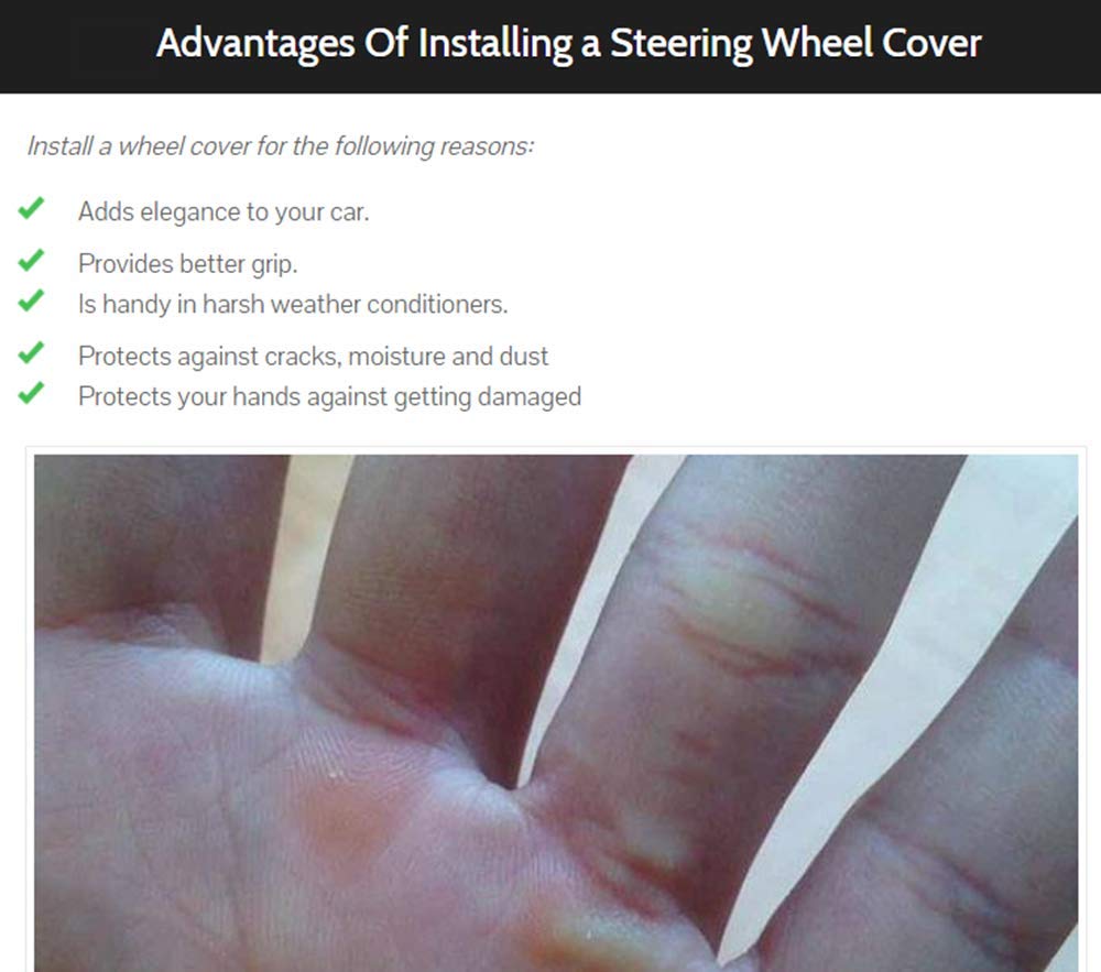 How to install If it is difficult to put it on at first time,because it has kind of hard rubber coating inside,you can heat it up a little under the sun to soften the rubber then put it while its warm. Its easier to stretch it a little. 1.Turn off the engine, make sure the steering wheel keep fixed. 2. Put the steering wheel cover on the top of steering wheel, pull tight the steering wheel cover from top to about half both side. 3. Turn out the edge of the rest cover and keep it touching the steering wheel's edge, then keep pulling tight the steering wheel cover from side to bottom. 4. Fix the bottom of steering wheel cover, then rotate and adjust the wheel cover to the best situation