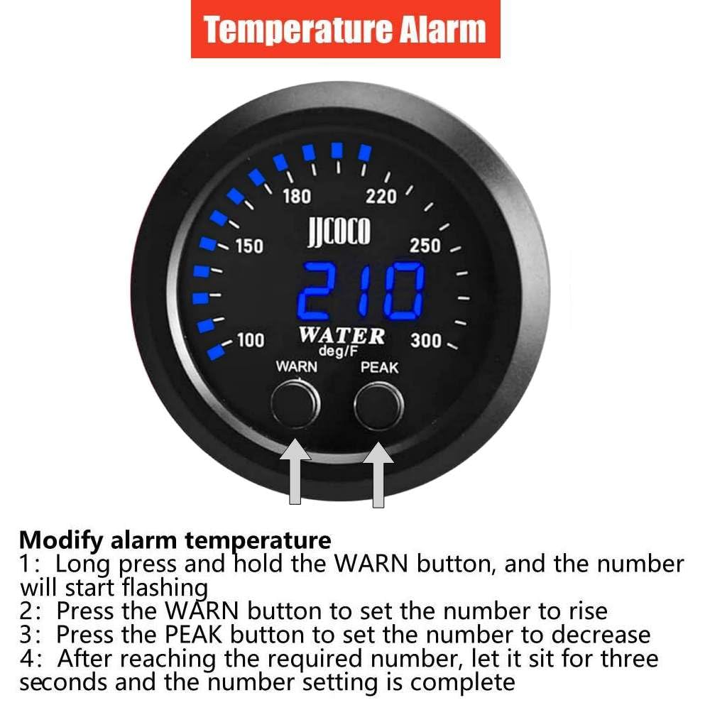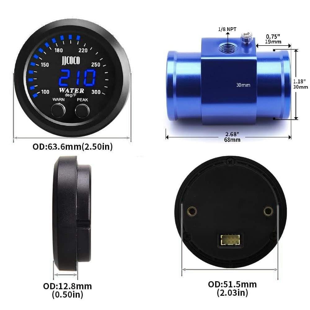 Read range:Our gauge will precisely monitor the temp within your coolant that is within a range of 32-300?.easy viewing at all angles during any lighting conditions.Easy installation:Our gauge includes electric wire,temp sensor with necessary mounting and installation hardware.Note:Please make sure the voltage is DC12V/24V,and this gauge is only used to measure water temperature!This gauge will precisely monitor the temp within your coolant that is within a range of 32-300?.This series is fully electronic with a Blue digital LED readout, which allows for easy viewing at all angles during all lighting conditions.Features:Digital display with blue LED.Used to measure the water temp of automobile.Measurement range is 32-300F(0~150C)High accuracy and easy operation.Specification:Unit: FMeasurement range: 32-300F(0~150C)Power: 12V/24V DC, Max. 0.3ASensor mounting thread: NPT 1/8 ''Package including:1 X water temperature gauge1 X water temperature gauge sensor1 X Holder1 X Universal Water Temp Joint Pipe, Blue 30mm