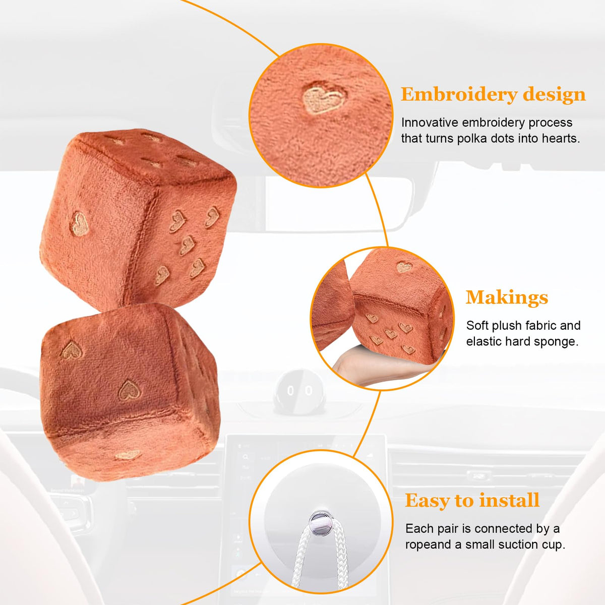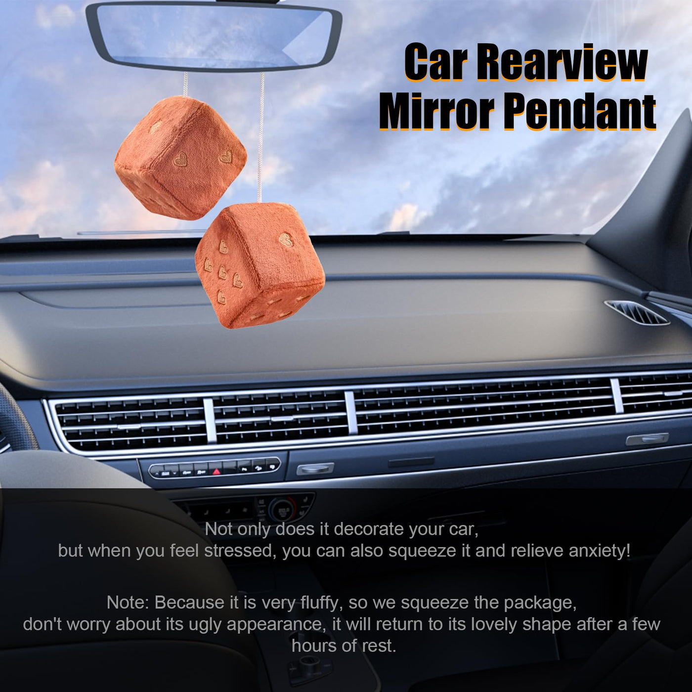 Ziciner Pair Fuzzy Plush Dice for Car Mirror, 3'' Retro Square Dice with Heart-Shape, Auto Rearview Mirror Hanging Ornament Deco