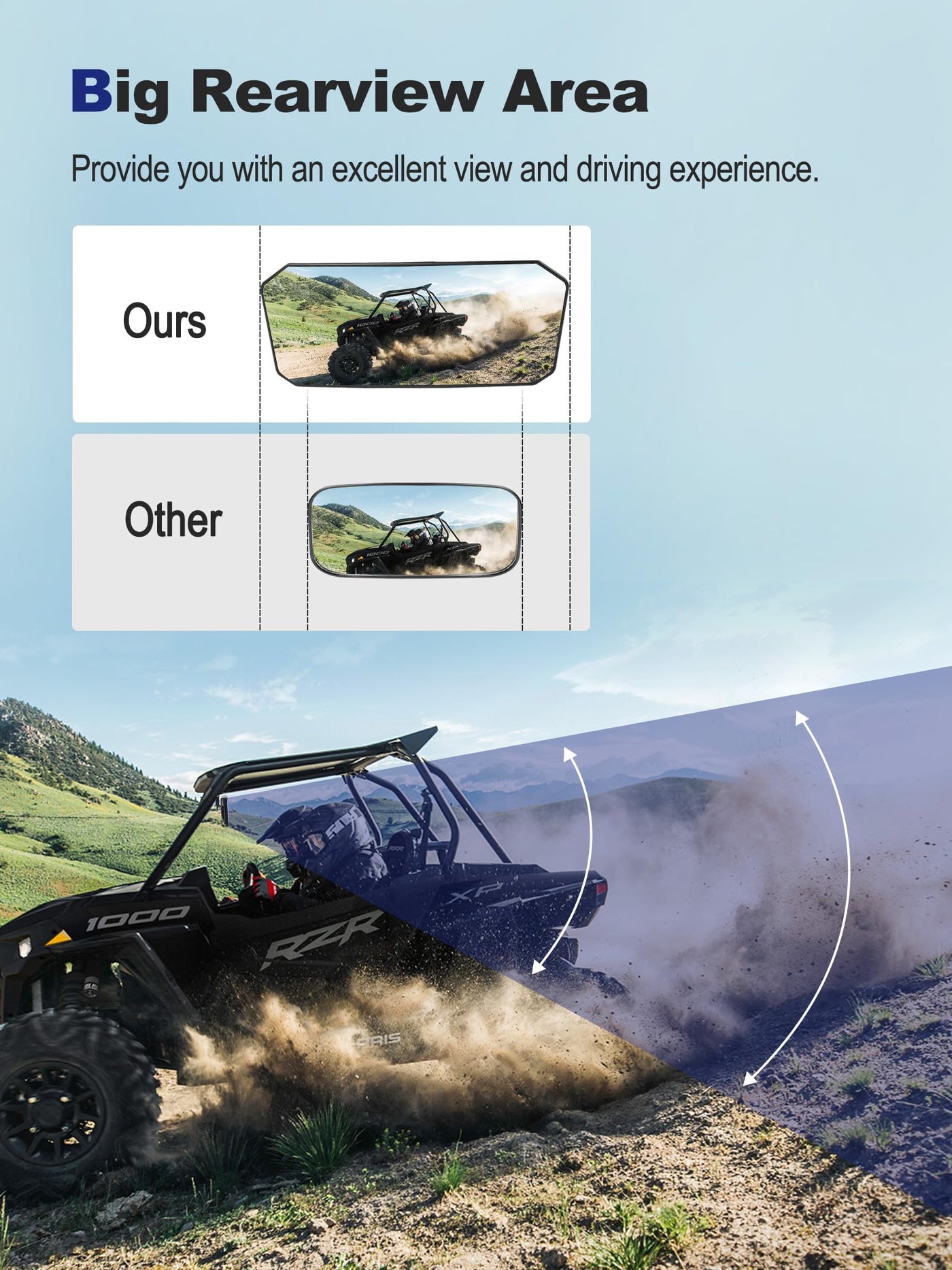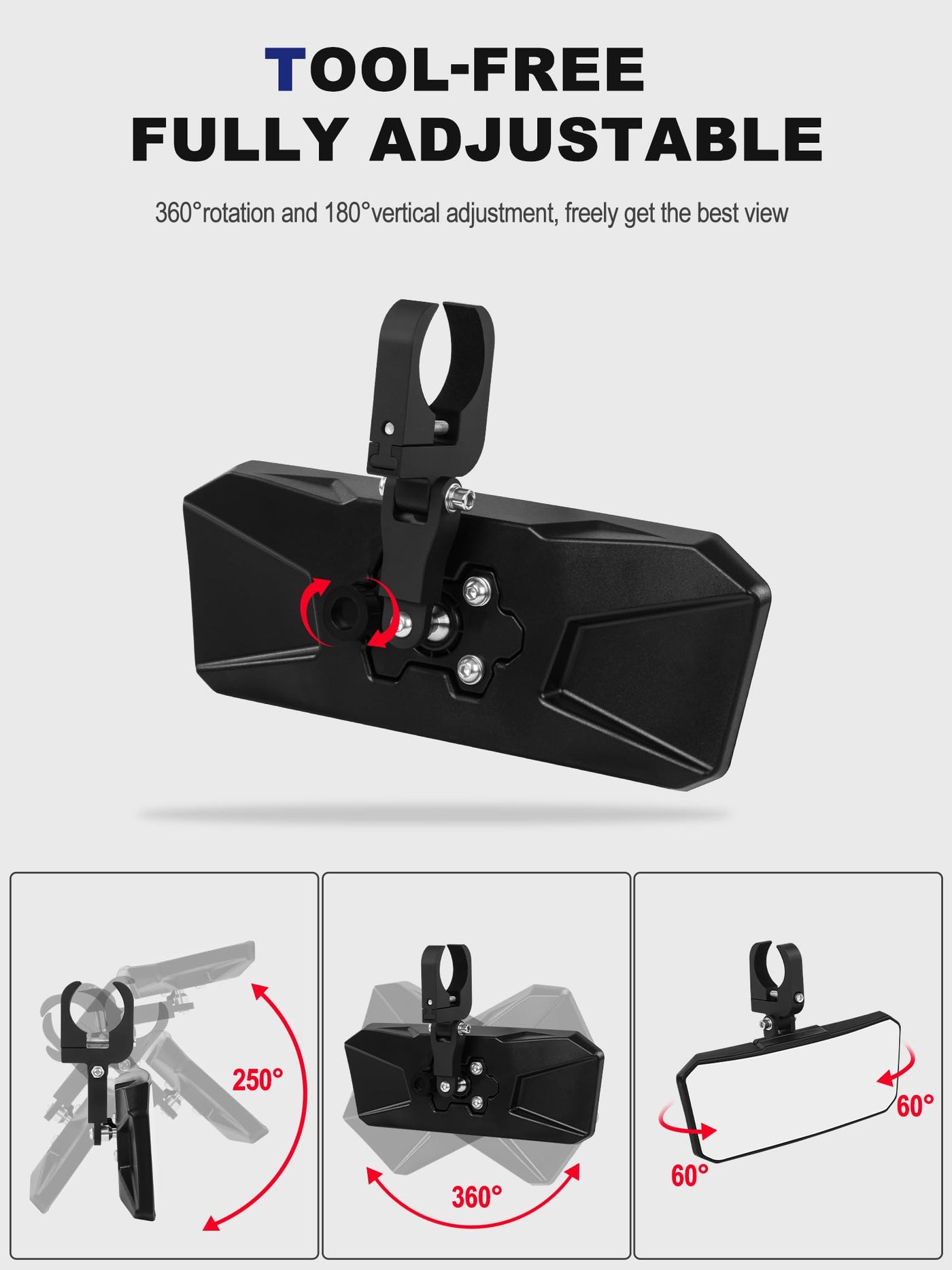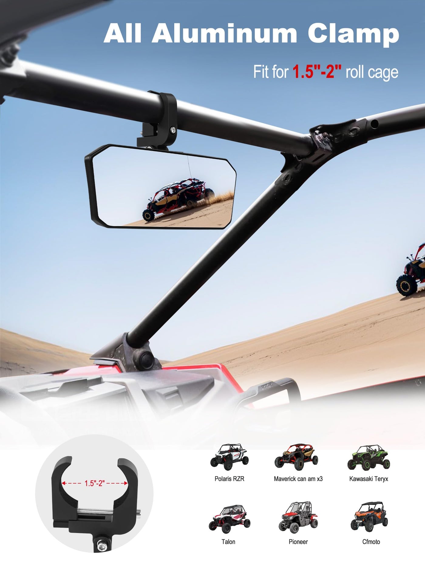 2025 ZIDIYORUO UTV rear view mirror-enhancing driving safety and comfort ZIDIYORUO UTV rearview mirror comes with a crystal-clear HD mirror and an enhanced wide-angle lens that completely wipes out blind spots. With 360 adjustable viewing angles, UTV center mirror guarantees the best driving experience.High-density ABS mirror, and special anti-glare, shatterproof glass ensure your safety while driving. Its truly the ultimate safety companion for all your outdoor adventuresUpgraded Aluminum C clamp fits 1.5''-2'' roll cage Compatible with: Polaris RZR (all models except 170), XP 1000 /XP 4 1000 / S 1000 / Turbo S / Turbo S 4 / XP Turbo / XP 4 Turbo/ S4 1000 / 900 / XP Turbo S / XP 4 Turbo S / S 900 / 570 / 800 / 570 Roll Cage Compatible with: 2020-2024 RZR PRO XP / 4 / 2022-2024 RZR PRO R Compatible with: 2025-1998 General XP 4 1000 / 4 1000 / 1000 Compatible with: Polaris Ranger 2002-2008 (Expect Ranger XP 900) Roll Cage Compatible with: Polaris Ranger Full Size/Mid Size Ranger 2009-2014 Roll Cage Compatible with: Maverick Can Am X3 / Commander Compatible with: 2025-1998 Kawasaki Mule/Teryx/Teryx 4 Compatible with: 2025 -2009 Honda Talon / Pioneer Compatible with: Cfmoto zforce all models / Uforce 600 Compatible with: 2013+ Arctic Cat Wildcat X 1000 Compatible with: John deere gator Compatible with: Yamaha Viking/ Wolverine /Rhino/ Ymaha XYZ Compatible with: Kubota RTV 900,1100 and 1140/ RTV X-series Please Note: Does not compatible with PRO FIT CAGE * FLAT BAR