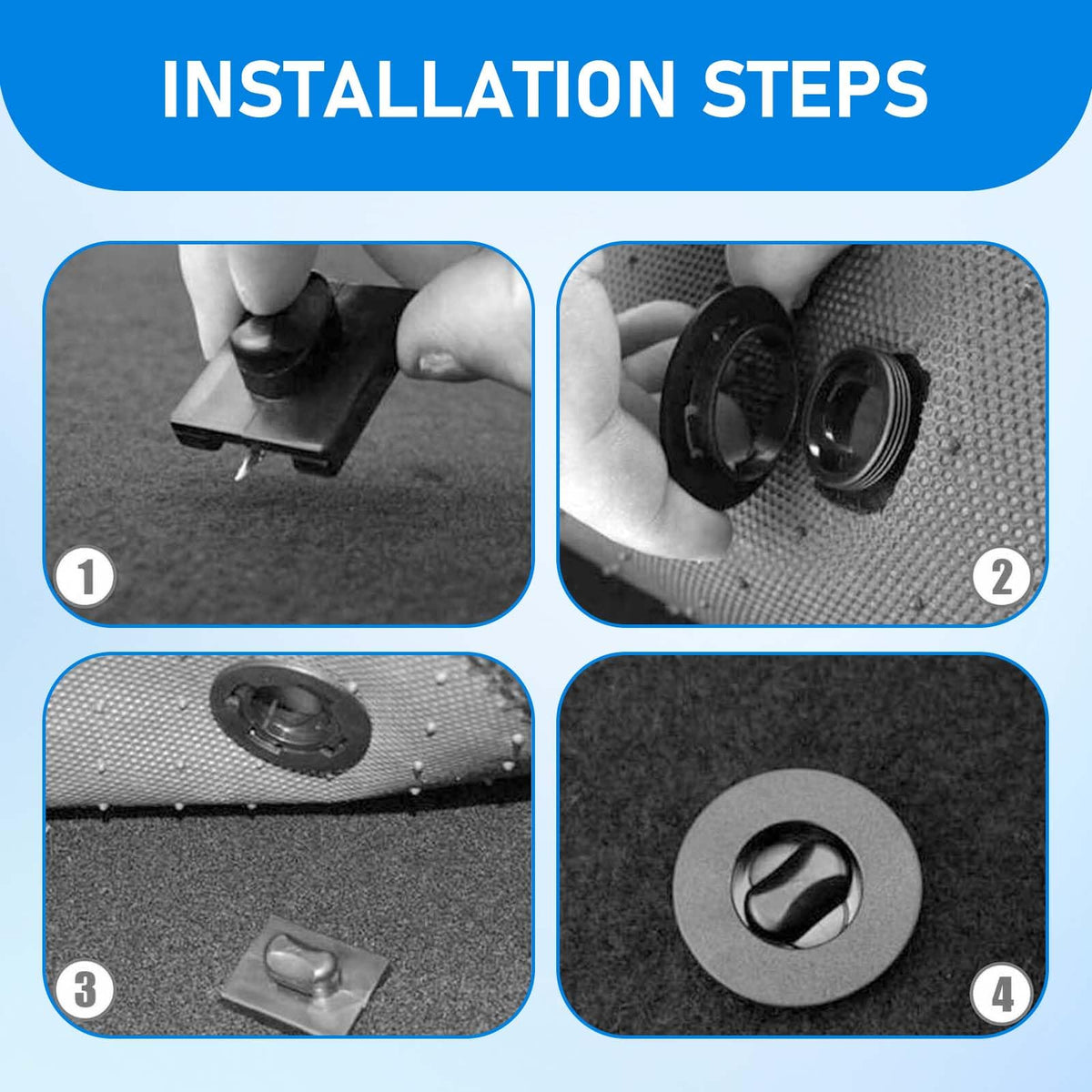 Durable ABS Material: These automotive carpet retainer clips are made of environmentally friendly ABS material that is durable and ensures that they will stand up to daily wear and tear without breaking or warping. The one-piece molding process ensures quality and longevity. | Anti-Slip Design: The anti-slip feature of these clips prevents the mats from shifting as the driver's feet move, reducing the need for readjustment. This is especially important for driving safety as it minimizes distractions caused by loose floor mats. | Secure Fixing: These clips have a good fixing effect and hold the mats firmly in place, preventing the mats from sliding around in the car. This reliable fixing method ensures that the mats stay in place even during bumpy rides, keeping the interior of the car neat and tidy. | Easy Installation: Installing these clips is a quick and easy process. Simply mark the screw locations on the floor of your car, punch holes for the clips in the floor mats, and then tighten the screws. This ensures a precise, secure installation and leaves you worry-free. | Versatile Package: Each package includes 4 x carpet mounting clips for all types of interior floor mats such as carpet, rubber and leather. This attention to detail and versatility enhances the overall driving experience by holding the mats securely in place.
