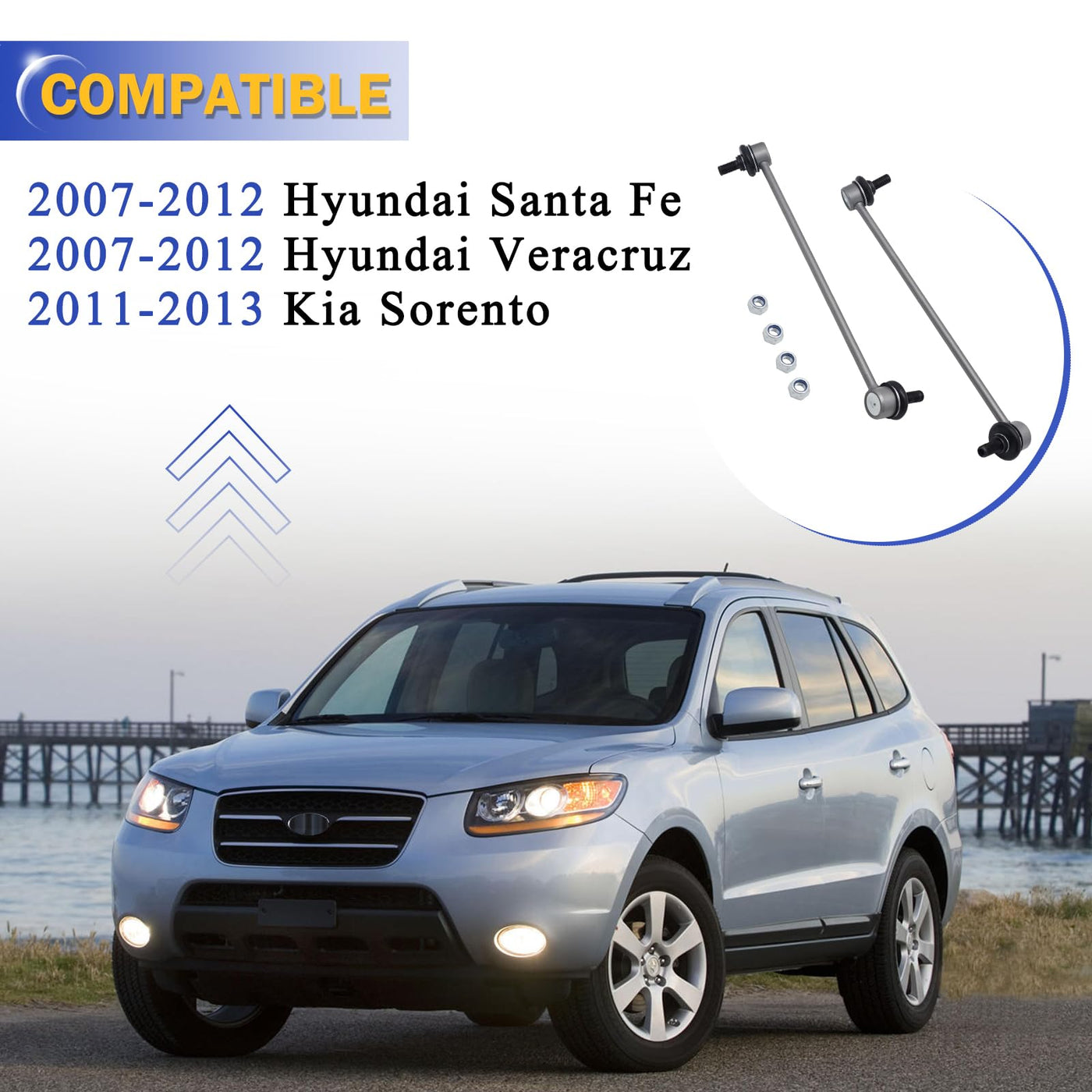 Q: What vehicles are compatible with the Zinc-Nickel Alloy Sway Bar Links?A: These sway bar links are designed to fit the following vehicles: 2007-2012 Hyundai Santa Fe, 2007-2012 Hyundai Veracruz, and 2011-2013 Kia Sorrento. Please confirm compatibility using the Amazon Fitment Filter.