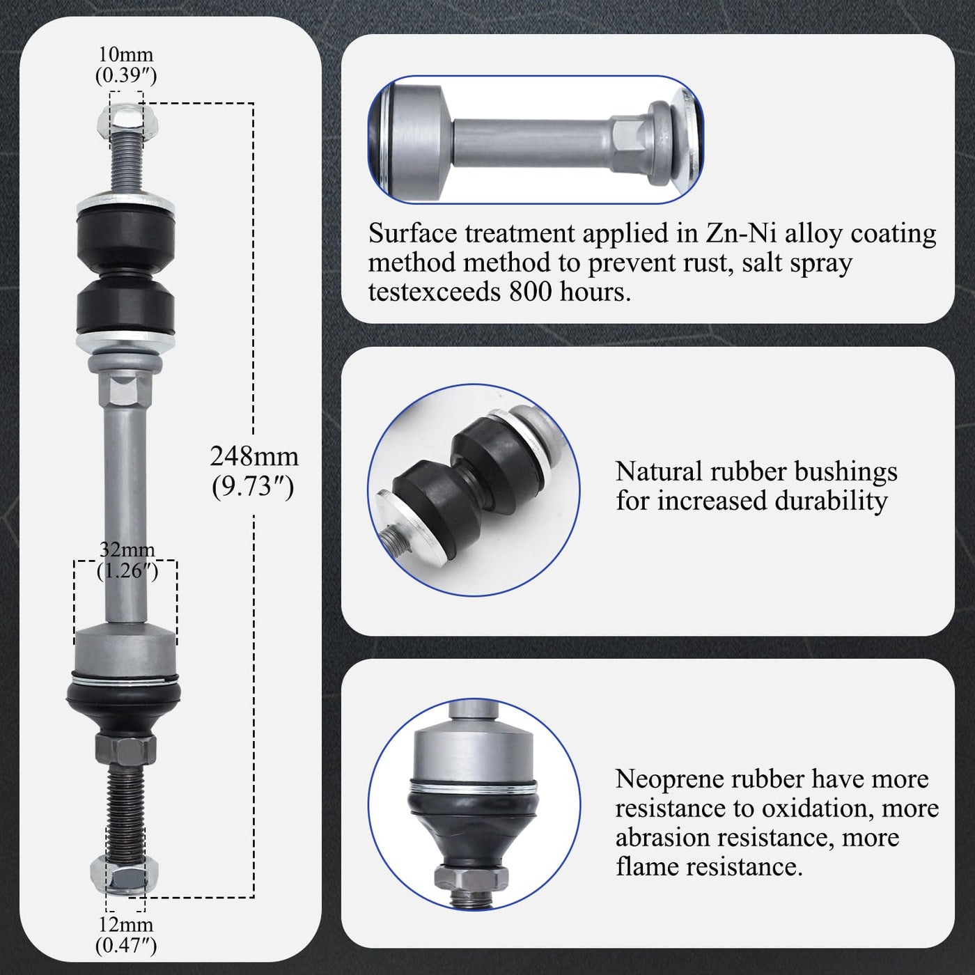 Q: What materials are used in the construction of this sway bar end link kit?A: The sway bar end link kit features a high-quality Zinc-Nickel alloy coating for corrosion resistance, neoprene rubber for enhanced durability, and carbon steel with heat treatment for increased fatigue strength.