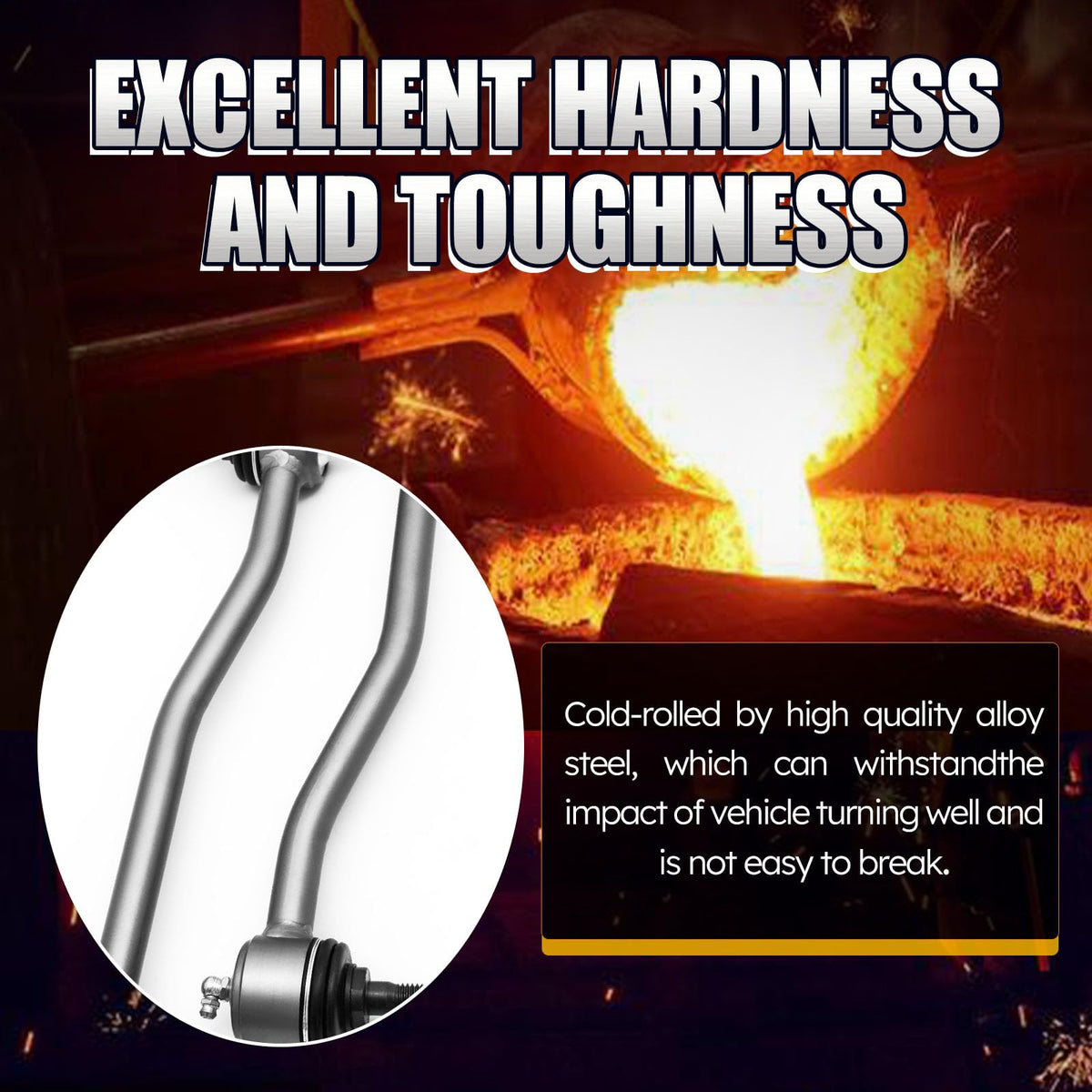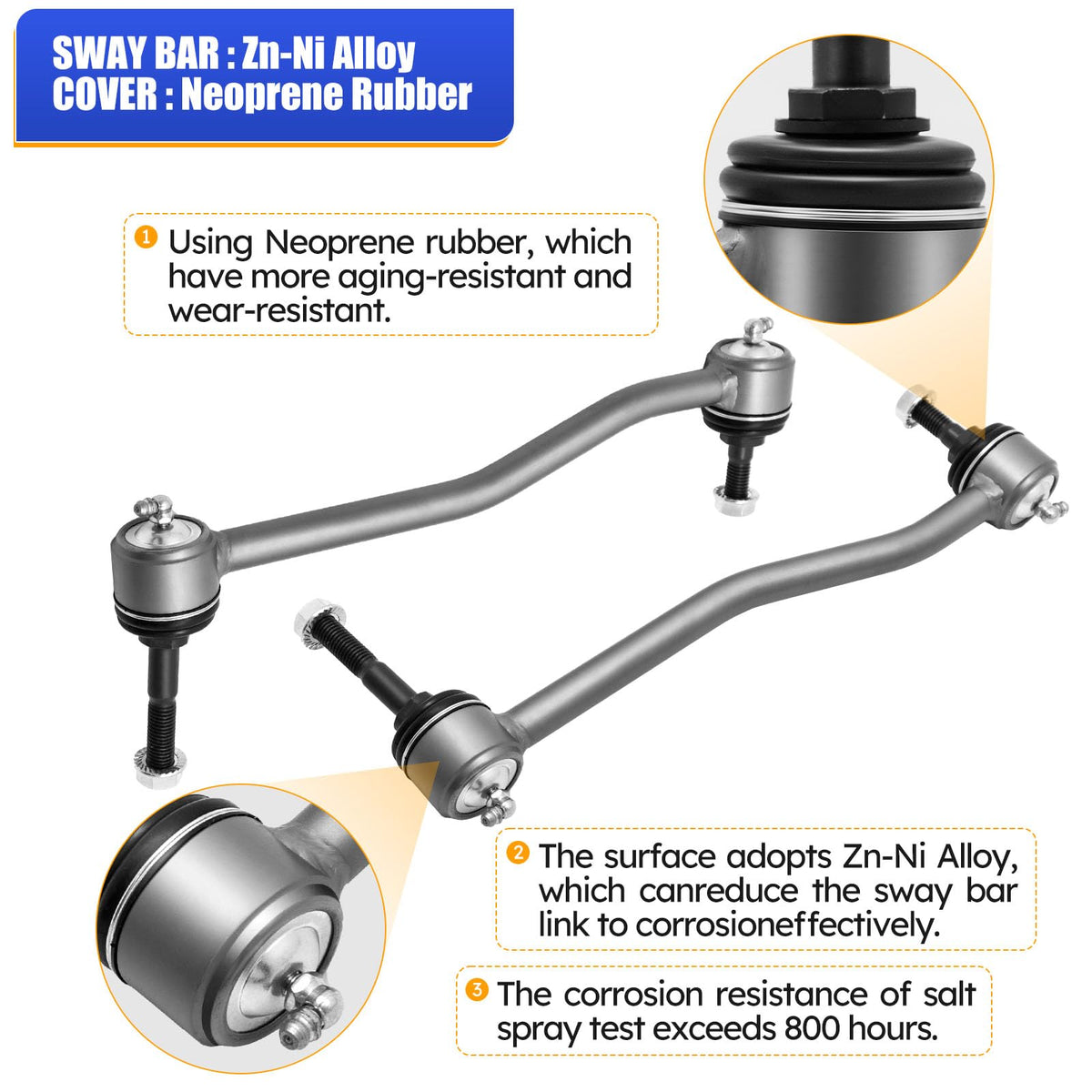 Q: What materials are used in the construction of these sway bar links?A: The sway bar links feature a high-quality Zinc-Nickel (Zn-Ni) alloy coating that provides excellent corrosion resistance, exceeding 800 hours in salt spray tests. They also incorporate neoprene rubber for enhanced oxidation and abrasion resistance, along with carbon steel that undergoes heat treatment and cold forging to improve fatigue strength.