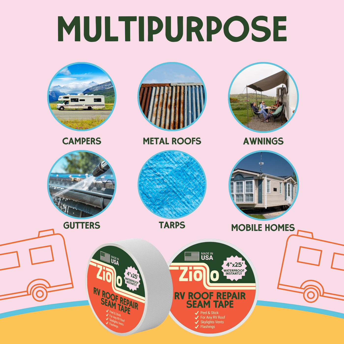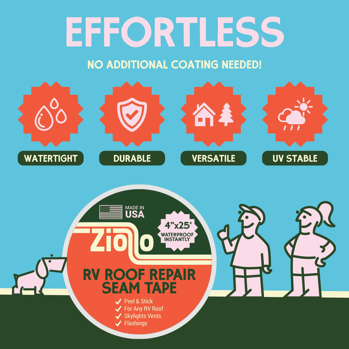 YOUR ROOF'S NEW BEST FRIEND, LEAKS' WORST ENEMY Remember why you bought your RV? It wasn't to become an amateur roof technician tracking down mysterious drips. Ziollo's RV Roof Repair Seam Tape puts those worries in your rearview mirror. Unlike ordinary roof sealant waterproof products that take hours to apply and days to cure, our peel-and-stick solution creates an instant watertight seal right where water wants to sneak in-along seams, around vents, and at flashing tape edges. It's basically a superhero cape for your roof's most vulnerable spots. Our premium 4-inch wide by 25-foot long butyl sealant tape outperforms competition with superior adhesion in scorching deserts or chilly mountain passes. Meanwhile, the bright white finish reflects sunlight, helping keep your RV cooler in summer-unlike that dark eternabond tape that turns your roof into a heat magnet. Complete your roof's defense system with our full lineup: start with Ziollo RV Roof Cleaner (because dirt isn't a proper base layer), use this seam tape for reinforcement on trouble spots, seal all remaining edges with Ziollo Lap Sealant, and for the ultimate shield, top with our 100% Silicone Roof Coating. From weekend warriors to full-timers, Ziollo has your roof covered. One roll tackles 25 linear feet of potential leak zones, so you can fix most camper roof sealant issues with minimal fuss. Plus, the included seam roller means perfect application every time. Stop playing detective with mysterious ceiling stains and start planning that cross-country trip. Because the only thing that should be dripping at your campsite is the s'mores chocolate on your fingers. Make the good times roll with Ziollo-less maintenance, more memories!