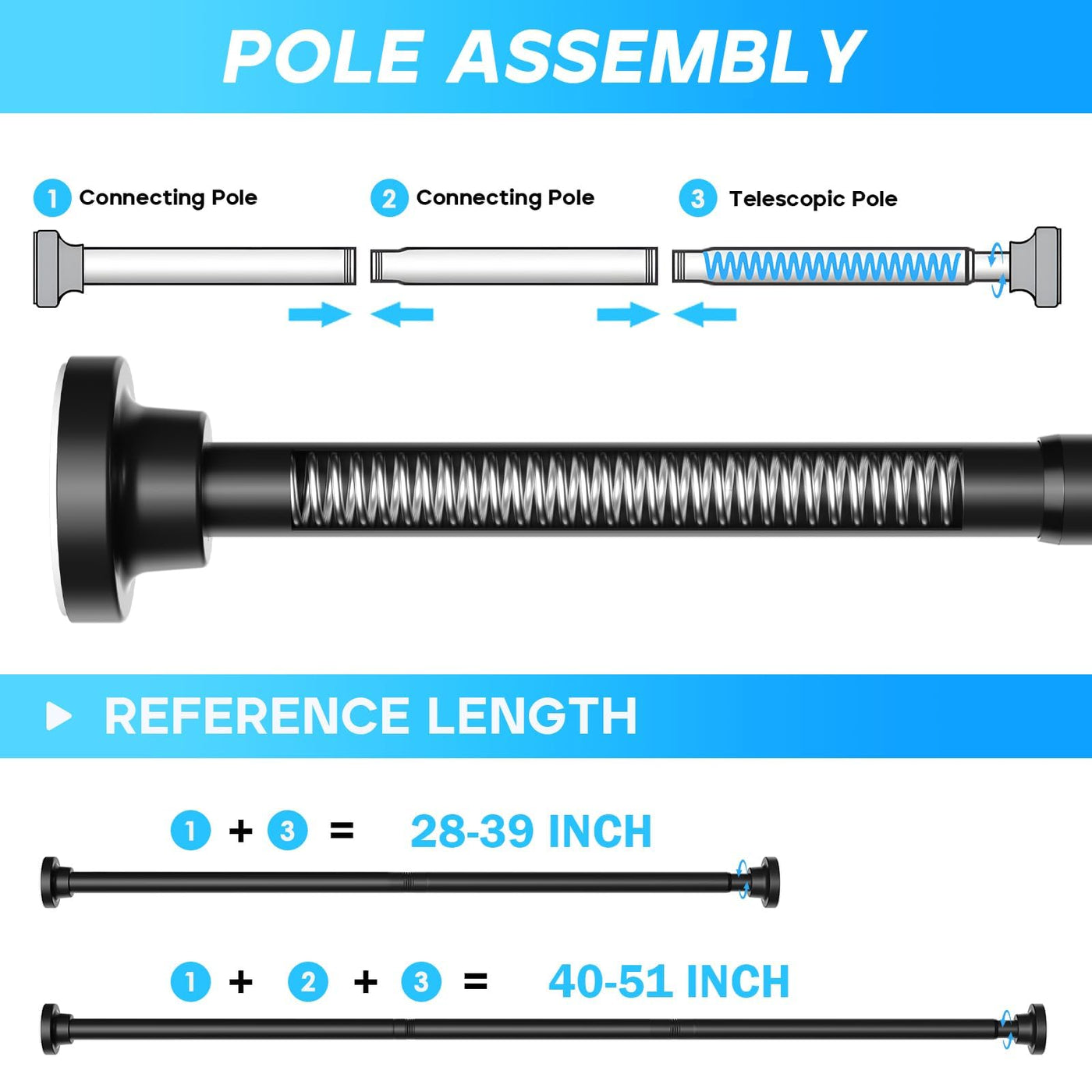 The black tension curtain rod is made of high-strength stainless steel, which has very high durability and strength, will not be easily deformed, rusted, corroded, and is more environmentally friendly and will not cause any harm to health. The easily adjustable design can easily adapt to spaces of different sizes, and supports length adjustments ranging from 28 inches to 51 inches, so as to better adapt to the needs of different window.