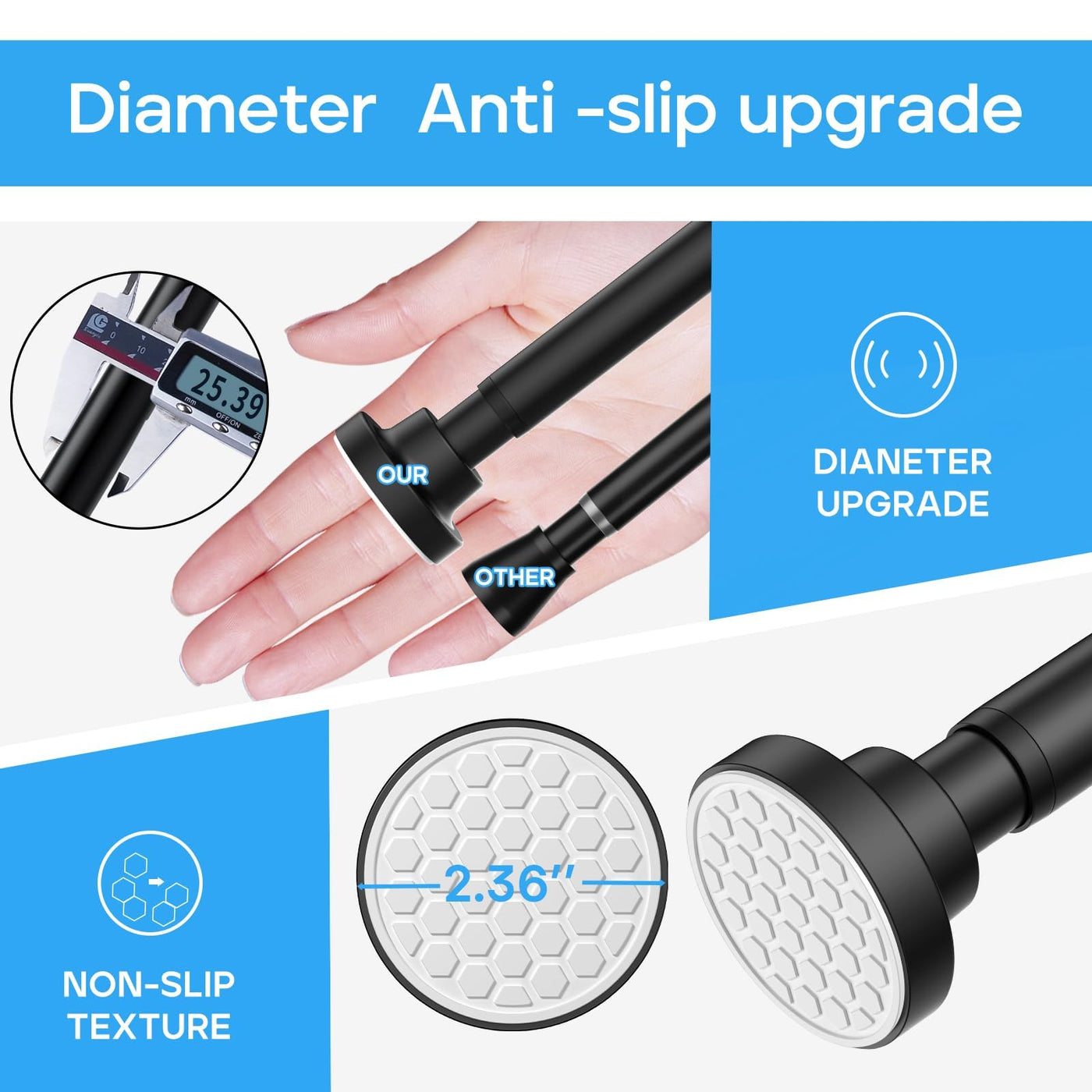 This spring rod has a honeycomb plastic pad design, which makes the tension rod more stable and prevents the rod from sliding or shifting. In addition, colors such as black and provide you with different choices to better match the decoration