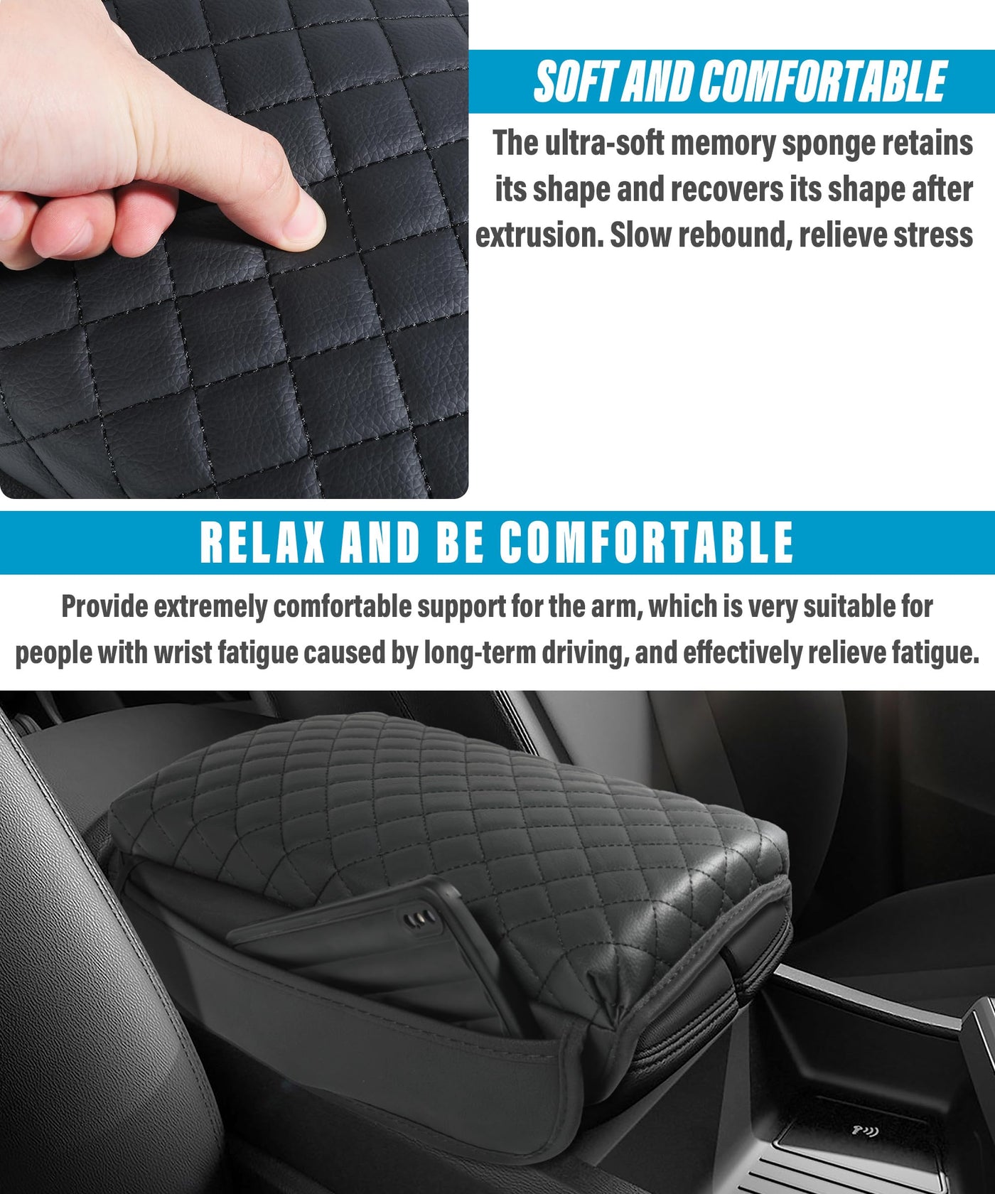 Size: < /b>13.77 * 7.87 * 1.18 inches< br > Material:< /b> Leather< br > Have you experienced these things?< /b>< br > -Car armrest contaminated with pet paws, dirt, and sticky fingers< br > -The armrest of a car has cracked or aged severely after years of sunlight exposure, affecting the aesthetics of the interior< br > -Wrist fatigue during prolonged driving< br > Buy Now! Help you solve these problems:< /b>< br > -Collisions and scratches on the armrest box before installation< br > -After installation, the leather armrest cover can protect your center console from scratches, cracks, and stains, while also enhancing the interior appearance of the vehicle.< br > -High quality materials, waterproof, durable, reduce elbow pressure during driving, alleviate fatigue, and provide you with a more comfortable driving environment< br >