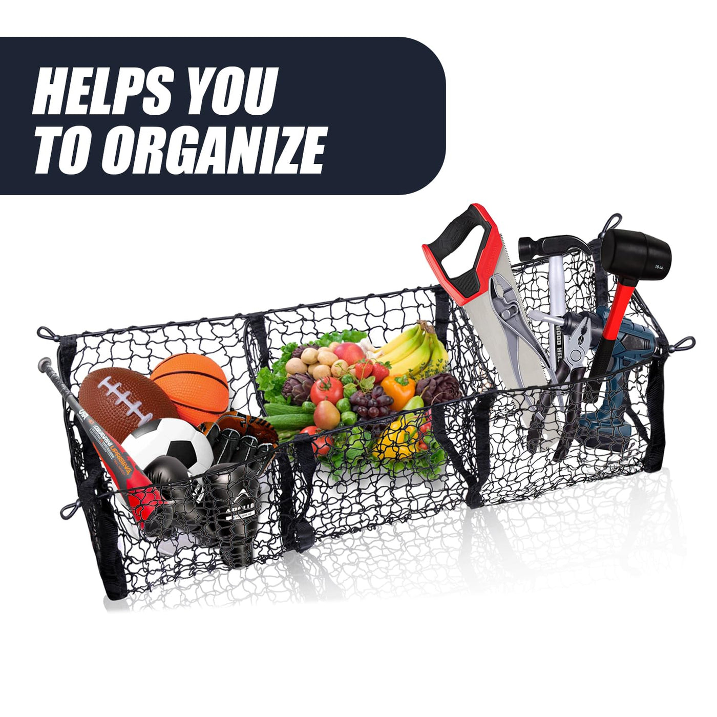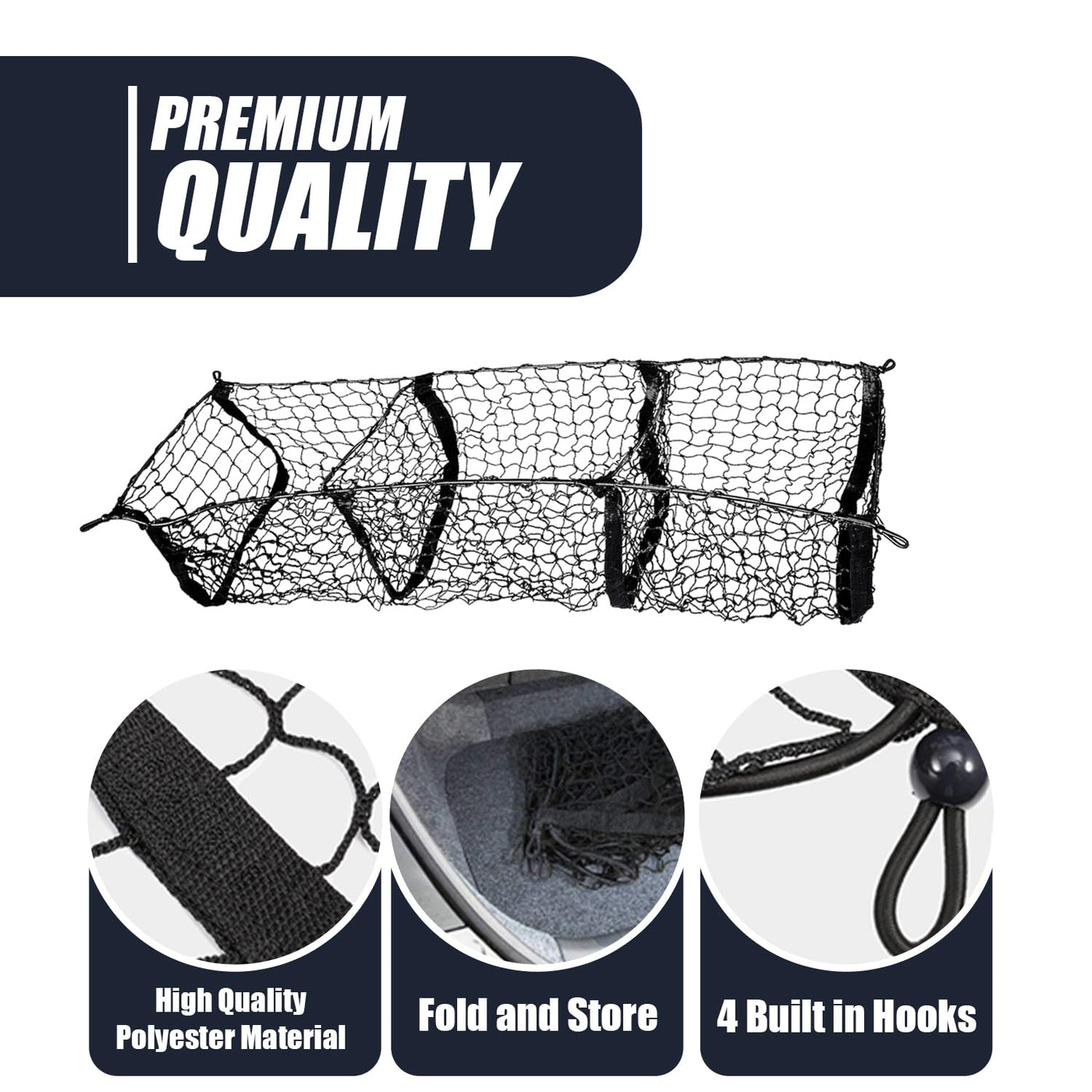 Q: How does the Zone Tech storage net help keep my trunk organized?A: The Zone Tech storage net features three pockets that help you organize and store groceries, gear, tools, and other items, ensuring your trunk remains clutter-free and everything stays in place.