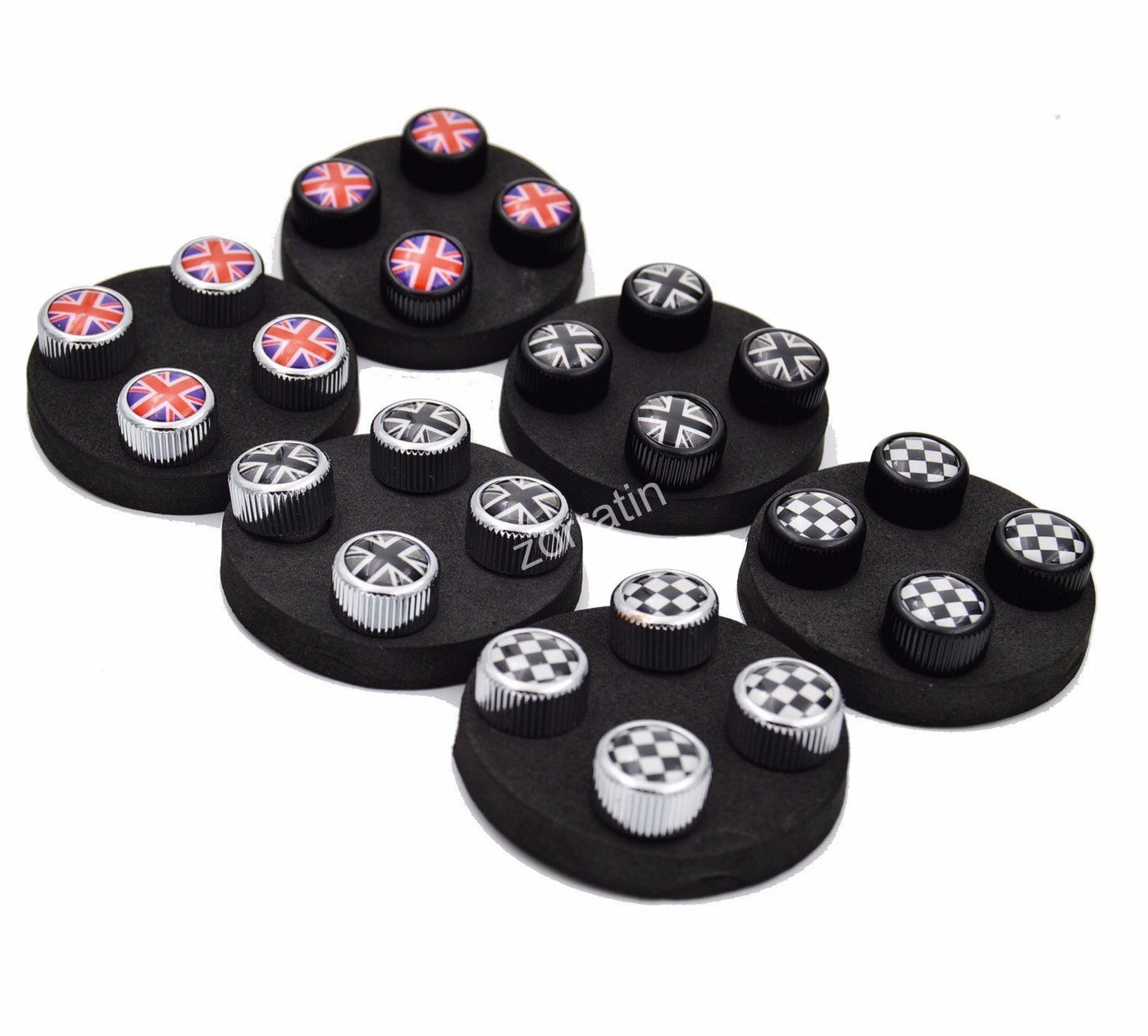 Q: Do the Zorratin Valve Stem Caps come in different colors or designs?A: The Zorratin Valve Stem Caps feature a classic chrome design with a black Jack button. Currently, this specific design is the only option available.