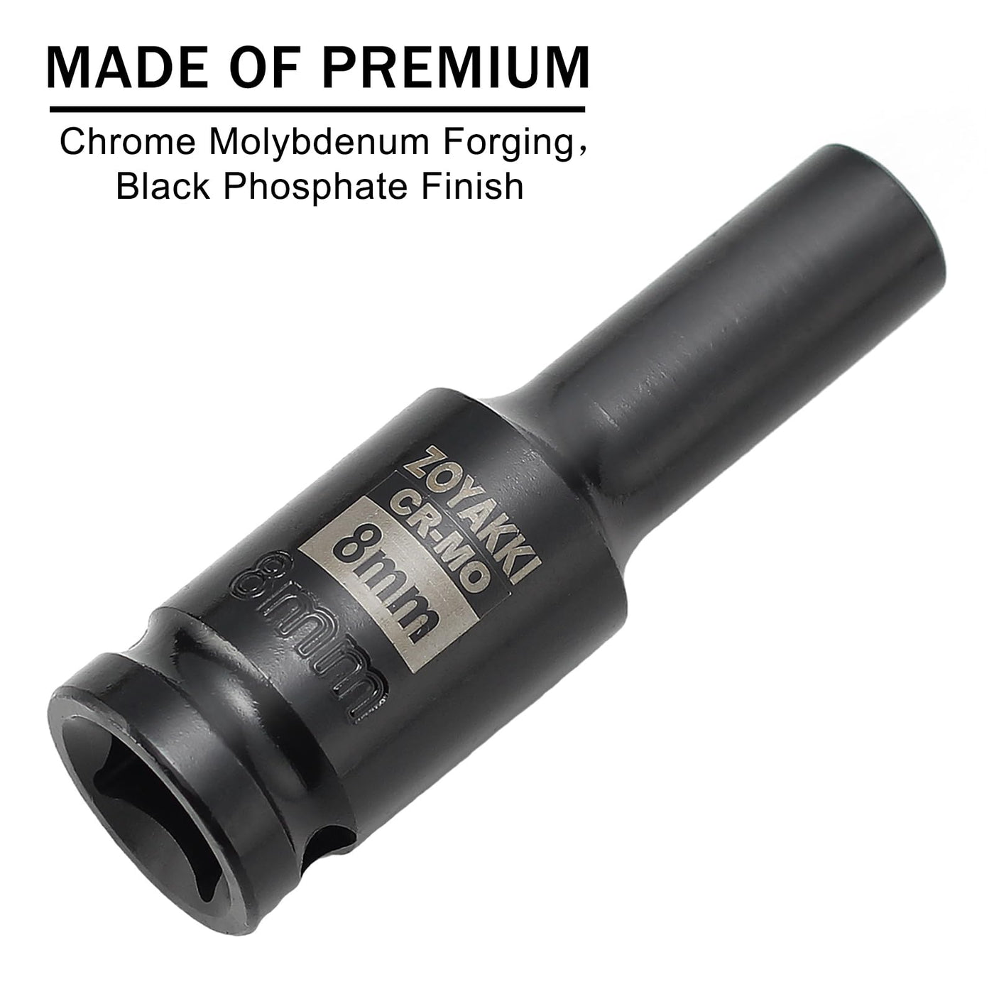 Q: What materials are used in the ZOYAKKI 8mm Deep Impact Socket?A: The ZOYAKKI 8mm Deep Impact Socket is manufactured from premium chrome molybdenum steel, providing exceptional strength and durability. It also features a corrosion-resistant black phosphate finish to enhance its longevity.