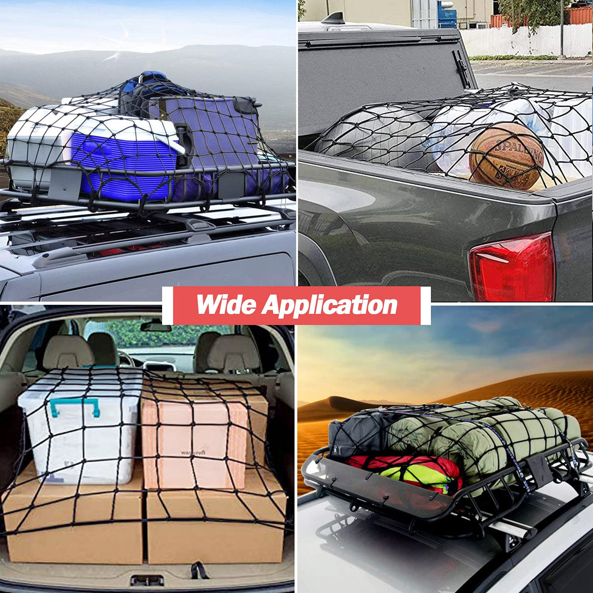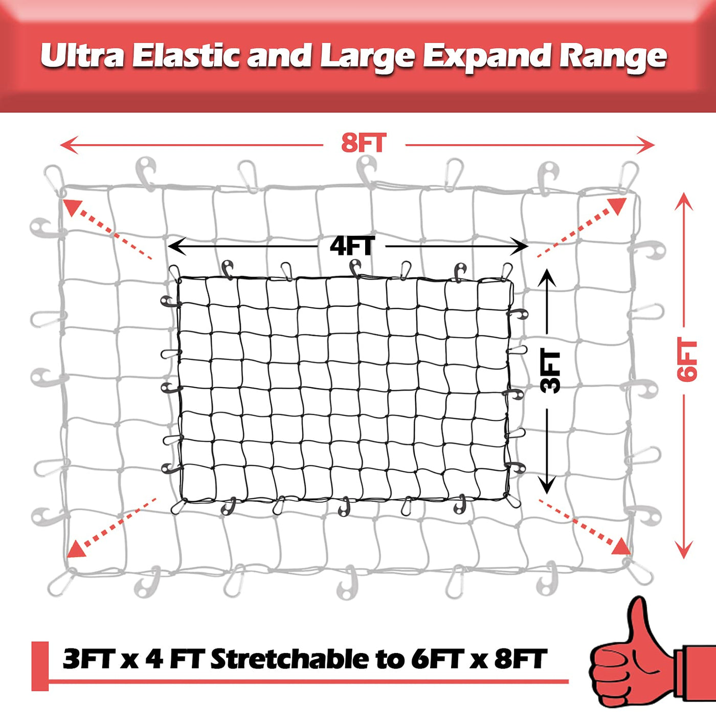 ZUOZE Natural Latex Core Super Duty Cargo Net for Roof Rack 3'x4' Stretches to 6'x8' | 12 Metal Carabiners + 12 Hooks | Small Tight 4 x4 Mesh Bungee Net for Trunk SUV, ATV, UTV, Cargo HitchOur universal BUNGEE CARGO NET is 5mm bungee webbing and 3 x 4 size (stretch to 6 x 8). Such size is a perfect solution for large truck bed loads for camping, traveling, moving or carrying any other thing in your pickup or trailer.?PREMIUM QUALITY?Our elastic nets are made with Premium Quality Latex Bungee Material. Latex Bungee Stretches extra far and holds its shape when unstretched. Bungee material is covered in a durable and UV-resistant nylon sheath to preserve the look and longevity of the net.?4 x 4 MESH DESIGN?The 4 x 4 tight mesh square is designed for keeping small size secure and providing more strength and protection when stretched over larger cargo items such as washing machine, refrigerator and other large luggage.?COMPLETE HELPER?12 adjustable aluminum alloy D-ring carabiner clips and 12 ABS hooks provide convenience to hook on your truck bed. And they can adjust the tightness of the net by moving clips from 1 mesh square to another.?EASY TO INSTALL?The cargo net is easy to install. And because we know the most disturbing thing is a tangled net and hooks strewn all over the floorboards or trunk, so we provide a bag for storage.?What You Get?1 x Latex Core Cargo Net 3ft x 4ft (Stretches to 6ft x 8ft)1 x Zipper Storage Bag12 x Metal Carabiners12 x ABS hooks