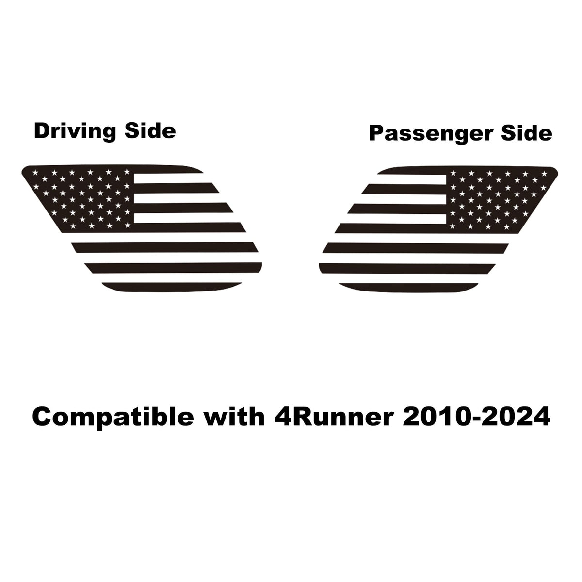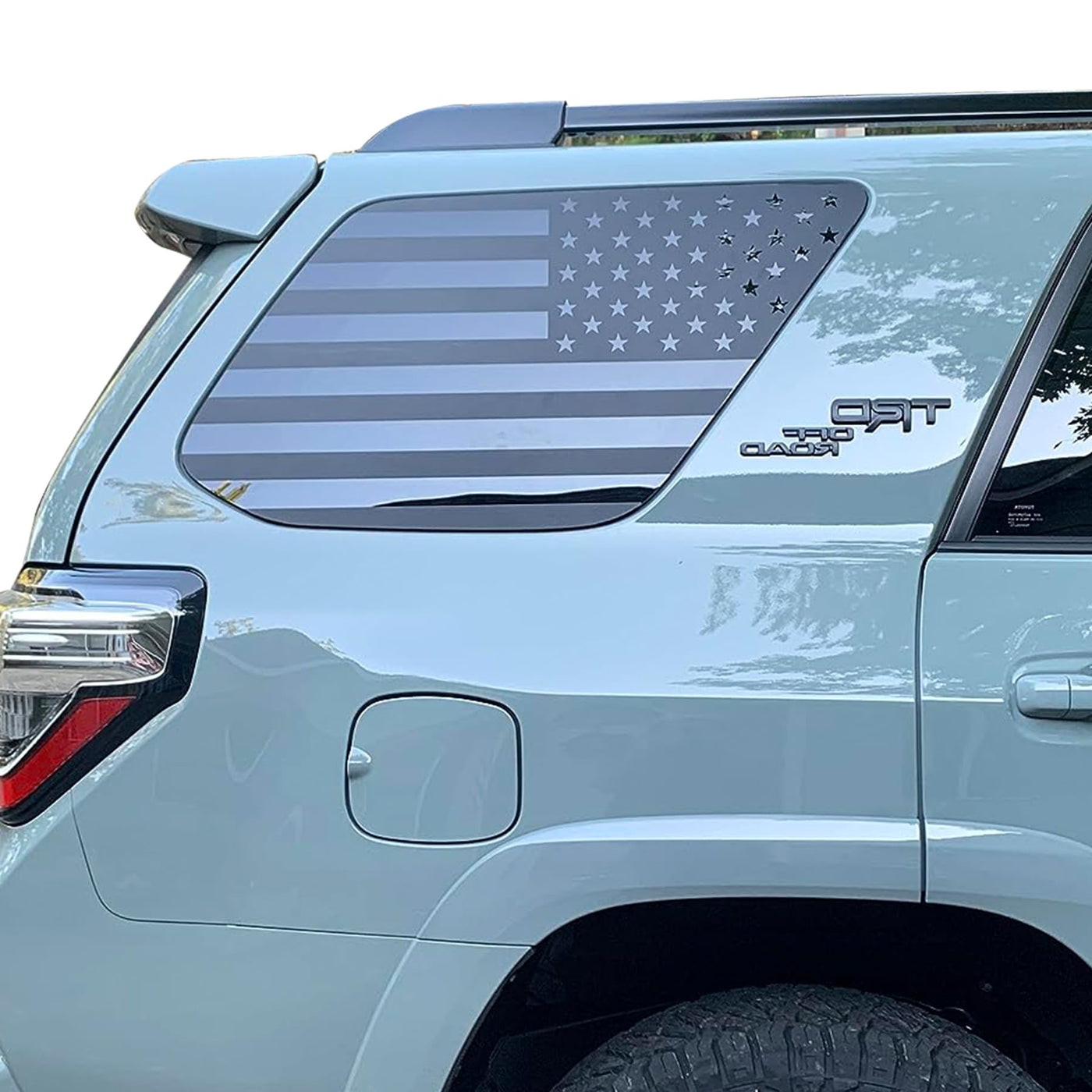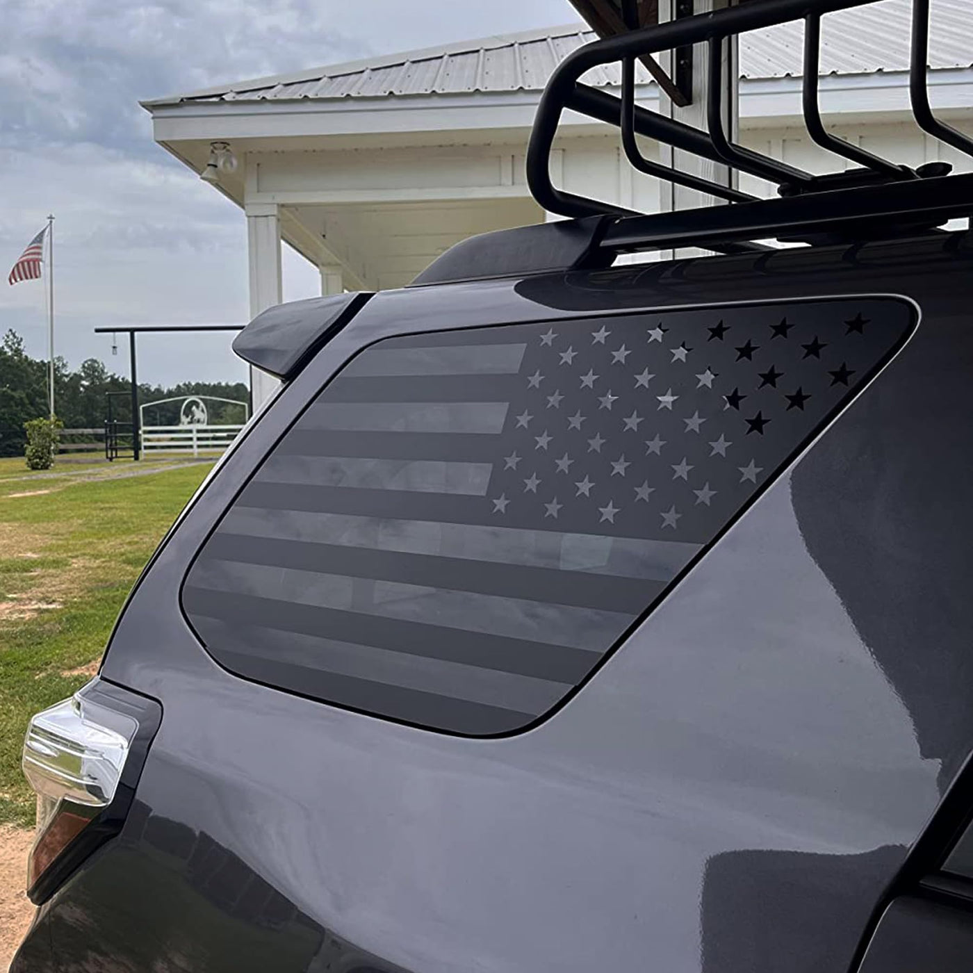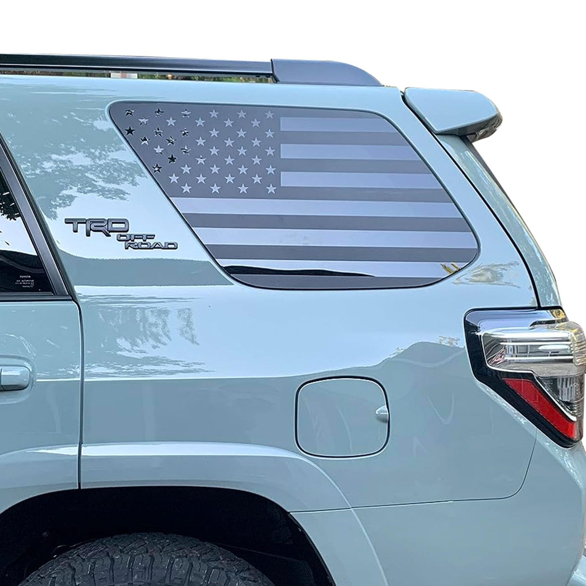 Show your patriotism and enhance your Toyota 4Runner's appearance with these high-quality, pre-cut vinyl decals. Measuring 16.9 inches wide and 31.79 inches long, these matte black, rectangular stickers feature a custom, American Flag pattern, perfect for outdoor use on your vehicle's rear side window. Easy to install with included tools and instructions, they leave no residue upon removal. Suitable for 5th generation 4Runners from 2010 to 2024.
